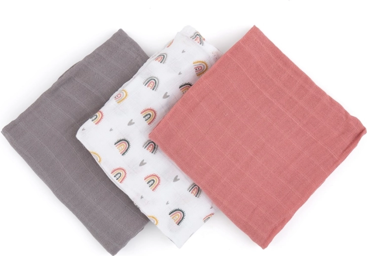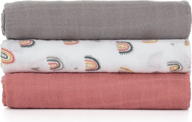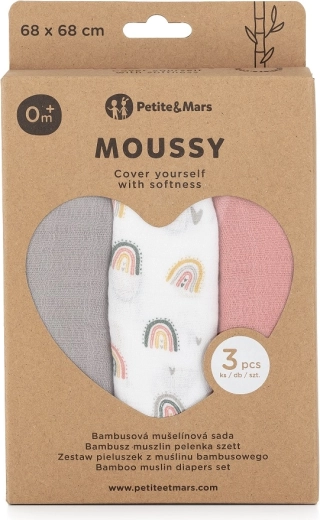 Set bambusovih muslin pelenâ PETITE & MARS Moussy Rose Rainbows donosi savršen spoj nježnosti i funkcionalnosti. Zahvaljujući kombinaciji bambusovih vlakana i pamuka, pelene su iznimno mekane, nježne prema koži, a istovremeno izdržljive. Prekrasni motivi duge i srdašaca u kombinaciji s neutralnom sivom i nježnom ružičastom uklapaju se u svaku bebi opremu.