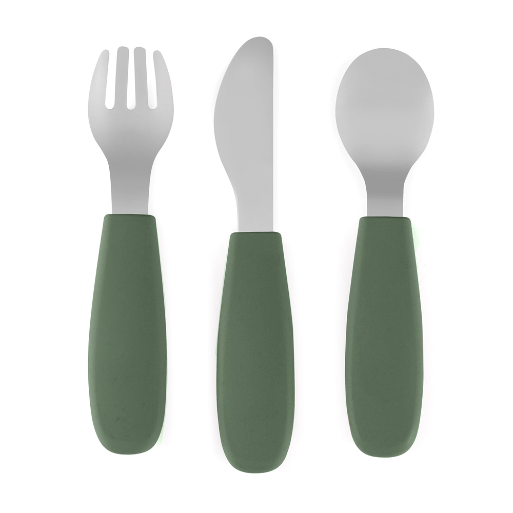 Set pribora PETITE&MARS Take&Match Misty Green dizajniran je za male dječje ruke i sigurne prve korake prema samostalnom jedenju. Funkcionalni dijelovi od kvalitetnog nehrđajućeg čelika izdržljivi su i higijenski, dok meke silikonske ručke pružaju siguran, protuklizan hvat. Nježno zaobljeni rubovi povećavaju sigurnost pri svakom zalogaju.