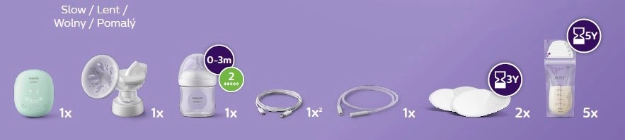 - Motorska jedinica, silikonska cijev, USB‑C kabel, set za izdajanje s umetkom, bočica Natural 125 ml, duda sa sporim protokom (1 kom), zatvorna pločica (1 kom), navojni poklopac, vrećice za mlijeko (5 kom), prsni ulošci (4 kom)