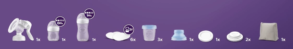 - Ručna izdajalica s poklopcem grla (1×), bočica 125 ml s dudom 0m+ (1×), bočica 260 ml s dudom s protokom 1m+ (1×), jednokratni prsni ulošci (6×), izolacijska torbica (1×), brtveni poklopac (1×), VIA čašice s poklopcem (3×), VIA adapter (1×)