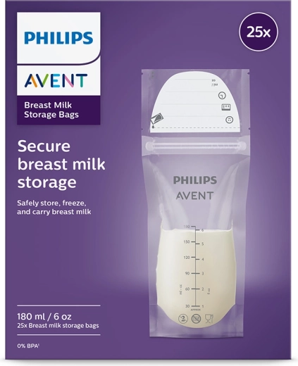 Praktične vrećice Philips AVENT za sigurno čuvanje majčinog mlijeka zapremnine 180 ml u pakiranju od 25 komada. Predsterilizirane su, imaju dvostruki zatvarač protiv curenja, pojačane šavove i dvoslojni materijal za pouzdano skladištenje u hladnjaku i zamrzivaču. Zahvaljujući širokom otvoru lako se pune i izlijevaju, a zahvaljujući čvrstoj izvedbi stoje samostalno. Materijal je bez BPA, a vrećice se radi uštede prostora mogu spremati položeno.