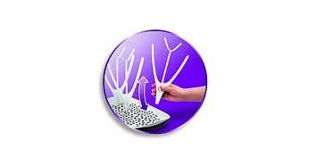 Stalak za sušenje Philips Avent dizajniran je za brzo i pregledno sušenje svih svakodnevnih potrepština za hranjenje djeteta. Zahvaljujući pametnom rasporedu klinova prima do 8 bočica, sisače, prstenove, dijelove izdajalice i ostale dodatke. Uklonjiva posuda prikuplja ocijeđenu vodu i održava radnu plohu suhom i čistom.