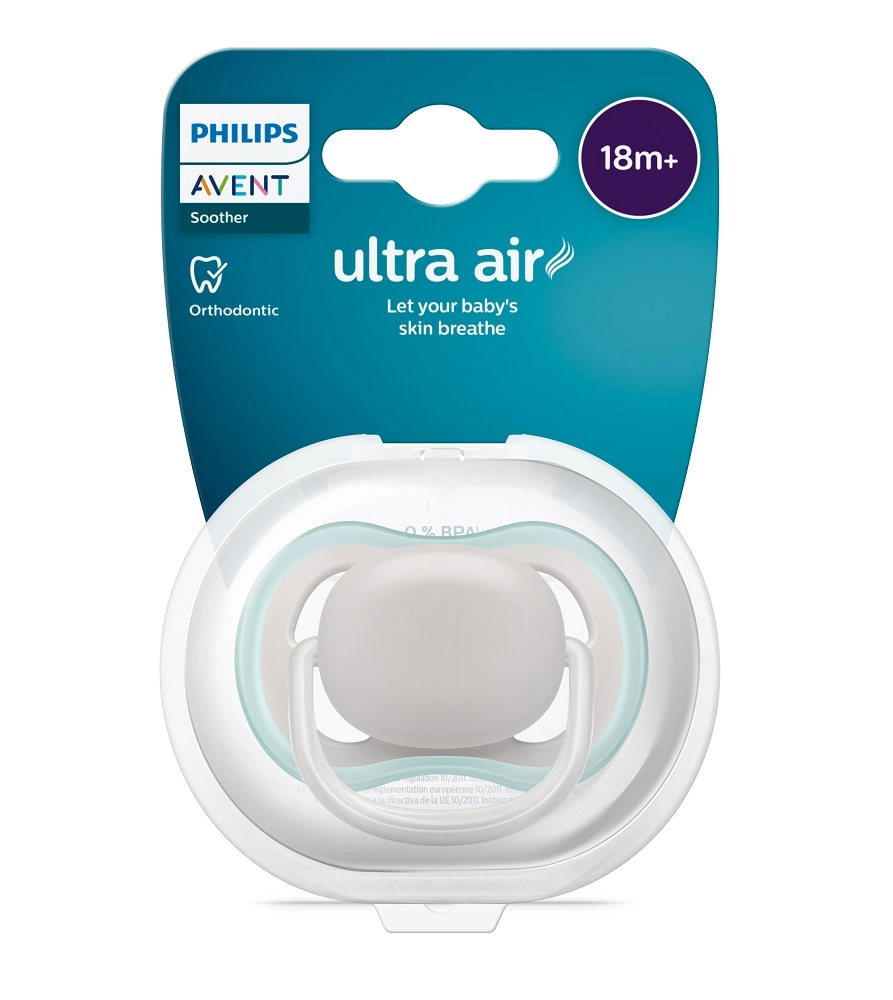 Philips Avent Ultra Air je duda osmišljena za udobnost i zdravi razvoj. Veliki otvori za zrak osiguravaju bolje strujanje zraka i pomažu održati osjetljivu dječju kožu sušom. Mekana, teksturirana i iznimno čvrsta silikonska sisa poštuje prirodan oblik nepca, zubi i desni, pa je idealna i u razdoblju nicanja zubića.