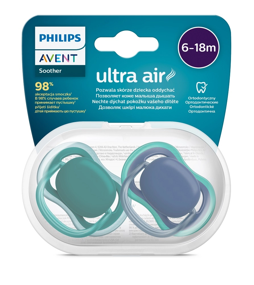 Umirite svoju bebu laganom dudem Philips Avent Ultra Air za djecu od 6 do 18 mjeseci. Ima iznimno velike ventilacijske otvore za bolju cirkulaciju zraka, mekanu silikonsku cuclu nježnu prema desnima i zubićima te ortodontski, simetrični oblik za prirodan razvoj usne šupljine. Praktična kutijica za brzu sterilizaciju u mikrovalnoj pećnici za 3 minute održava dude higijenski čistima kod kuće i na putu.