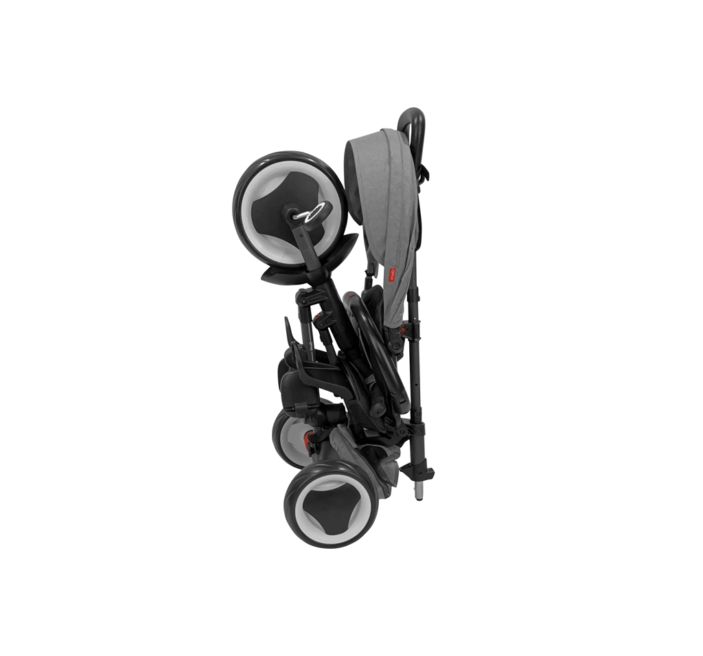 Sigurnost osiguravaju 5-točkasti pojasevi, odvojiva zaštitna prečka i kočnice na stražnjim kotačima. Antivibracijski EVA kotači ublažavaju neravnine i ne zahtijevaju održavanje. Sklopivost i brza manipulacija su standard: trokolica se sklapa bez alata na 3 klika, a zahvaljujući pametnom dizajnu nakon sklapanja je možete udobno premjestiti kao putni kofer.