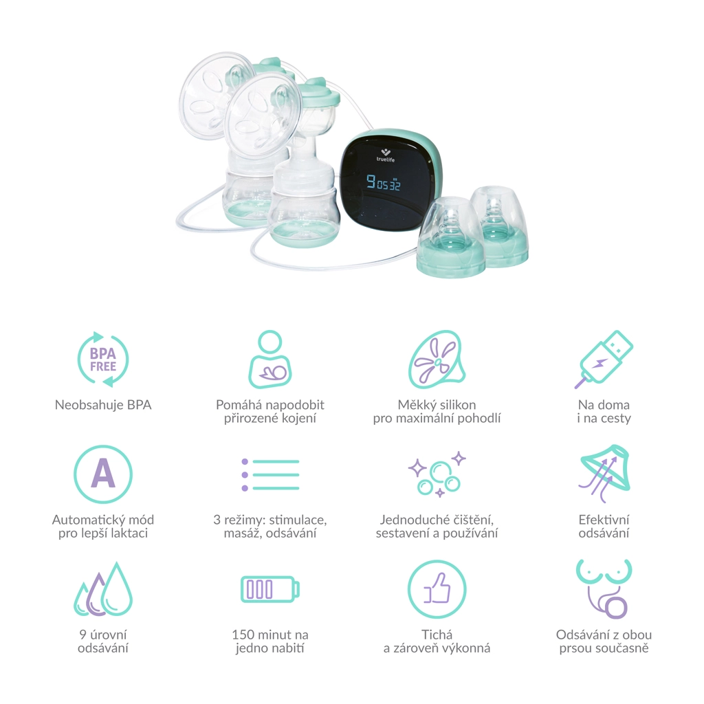 TrueLife Nutrio BP pouzdana je električna dvostruka izdajalica namijenjena mamama koje žele uštedjeti vrijeme i maksimizirati udobnost. Istodobno izdajanje iz obje dojke potiče laktaciju, štedi vrijeme i omogućuje imati mlijeko spremno za kasnije – u hladnjaku traje do 48 sati. Tehnologija MilkFlowStimulation® pomaže nježnoj stimulaciji toka mlijeka i prikladna je i kod poteškoća s dojenjem.