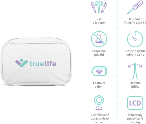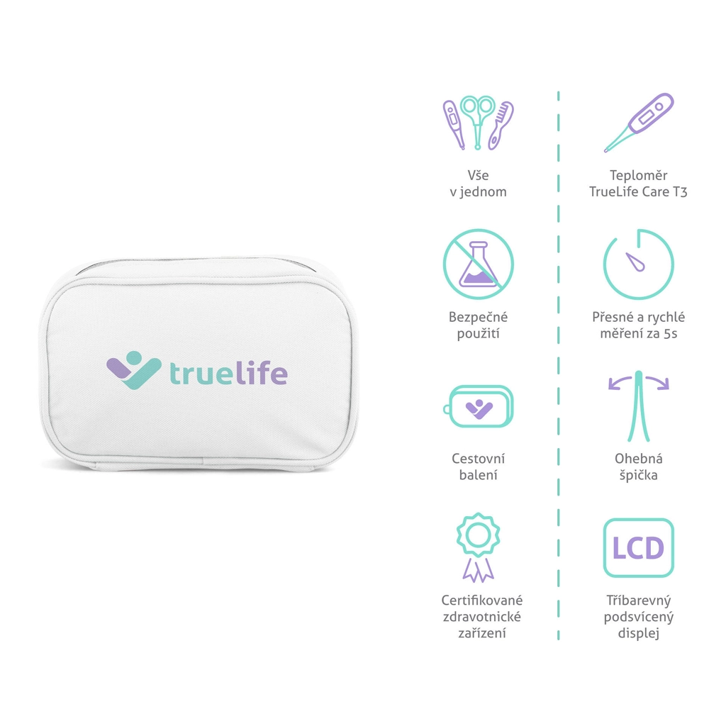 - Termometar TrueLife Care T3, aspirator za nos, oble škare za nokte, grickalica za nokte, češalj, četka s nježnim vlaknima, prstna zubna četkica, 3× raščica za nokte, putna futrola, upute i sigurnosne informacije