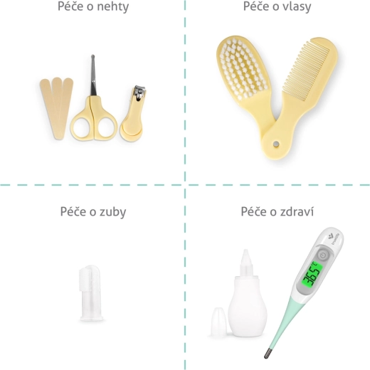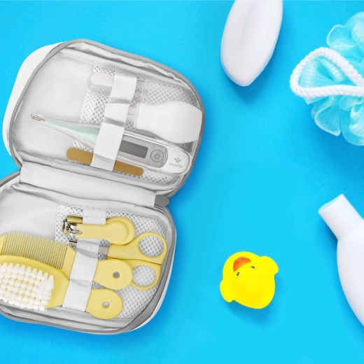 Sve su komponente od neškodljivih, lako perivih materijala i spremljene u kompaktnoj futroli s patentnim zatvaračem, kako bi pribor uvijek bio pri ruci i pregledno organiziran – idealno rješenje za dom i putovanja. Set je prikladan za novorođenčad i malu djecu te predstavlja i sjajan poklon za buduće roditelje.