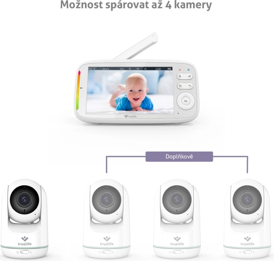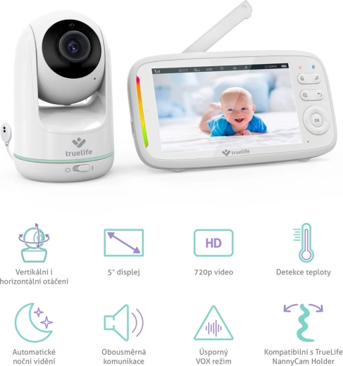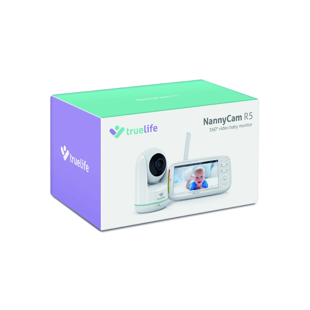 TrueLife NannyCam R5 je pouzdana video dadilja za moderne roditelje. Rotirajuća kamera s horizontalnim rasponom 330° i vertikalnim 135° u kombinaciji sa širokokutnom lećom pokriva cijelu sobu, dok HD razlučivost 720p osigurava čistu i oštru sliku na 5" IPS LCD zaslonu. Automatski noćni vid s infracrvenim diodama aktivira se sam, tako da vidite bebu i u potpunom mraku.