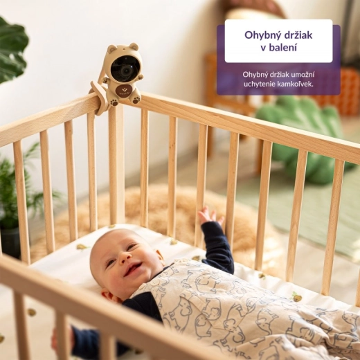 Diskretni silikonski medvjedić uklopit će se u dječju sobu. Savitljiv držač olakšava pričvršćivanje na krevetić ili policu, gdje god vam trenutačno treba.