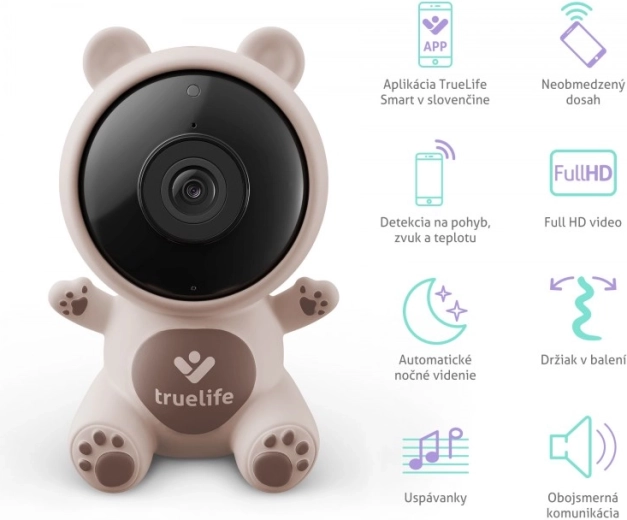 TrueLife NannyCam S3 Smart je elegantna video dadilja u obliku medvjedića koja se prirodno uklapa u dječju sobicu. Nudi kristalno čistu Full HD sliku s kutom gledanja od 100° i automatski noćni vid do 5 metara. Pri detekciji pokreta, zvuka ili promjene temperature odmah vas upozorava. Zahvaljujući dvosmjernoj komunikaciji možete umiriti bebu vlastitim glasom ili joj pustiti uspavanke, dok će nježno svjetlo noćne lampice stvoriti opuštenu atmosferu.