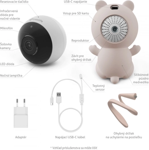- Pametna kamera NannyCam S3, silikonska navlaka u obliku medvjedića, USB‑C kabel sa senzorom temperature, napajajući adapter, fleksibilni držač za krevetić, upute i sigurnosne napomene, igla za resetiranje