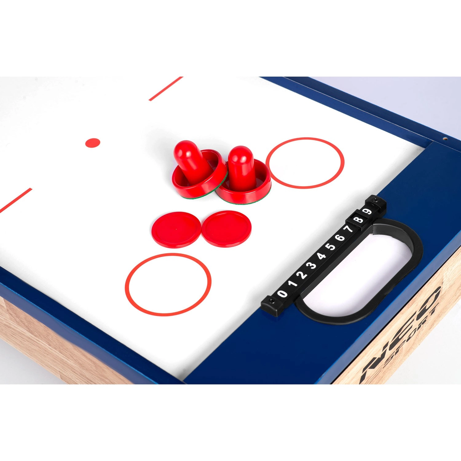 Uživajte u beskrajnoj zabavi s kompaktnim stolom 4u1 marke NEO-SPORT, koji zahvaljujući izmjenjivim pločama nudi stolni nogomet, air hokej, ping pong i biljar. Izdržljiva drvena konstrukcija, stabilna izvedba i kompletna oprema za trenutačnu igru čine ovaj stol idealnim izborom za obitelji i prijatelje u manjim prostorima.