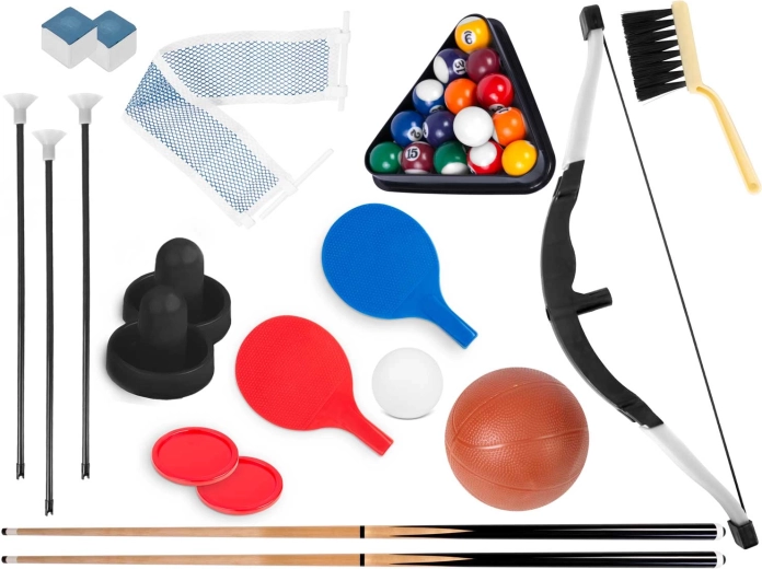 U pakiranju se nalazi: set bilijarskih kugli i trokut, 2 štapa (45 cm), krede, rekete i loptice za stolni tenis, mrežica, strikeri i pakovi za zračni hokej, koš s bočnom zaštitom, luk, 3 strijele i meta.
