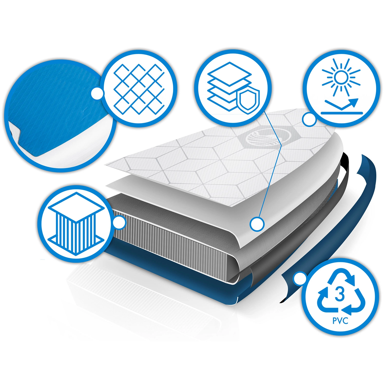 Višeslojni PVC, gusto Drop Stitch vlakno i ojačani šavovi osiguravaju visoku krutost, UV otpornost i dug vijek trajanja. Protuklizna EVA podloga za siguran stav.