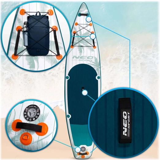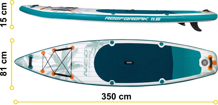 Neo-Sport Reefbreak je napuhujuća SUP daska dizajnirana za rekreativno veslanje, cjelodnevne izlete i prve pokušaje na vodi. Zahvaljujući dimenzijama 350 × 81 × 15 cm pruža izvrsnu stabilnost i sigurnost početnicima, a ujedno dovoljno brzine i držanja smjera za naprednije korisnike. Lagana, a ipak kruta konstrukcija Drop Stitch Light jamči visoku izdržljivost i jednostavno rukovanje pri prenošenju i skladištenju.