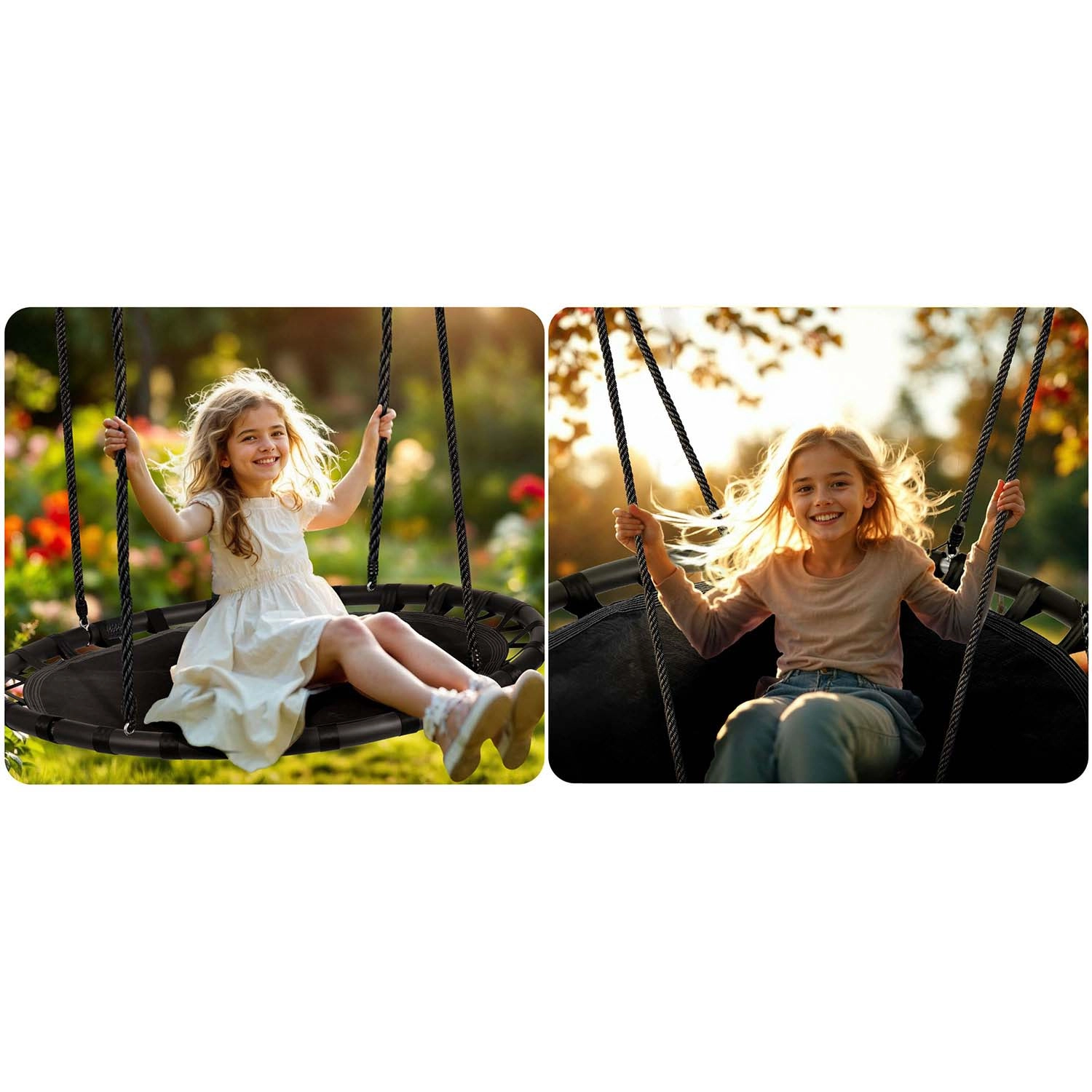 Zahvaljujući čvrstim pletenim užadima s glatkom regulacijom visine lako ćete namjestiti ljuljačku prema visini djeteta ili mjestu ovjesa. Promjer 110 cm pruža dovoljno prostora za sjedenje i ležanje, a nosivost 150 kg omogućuje ljuljanje više djece istovremeno.