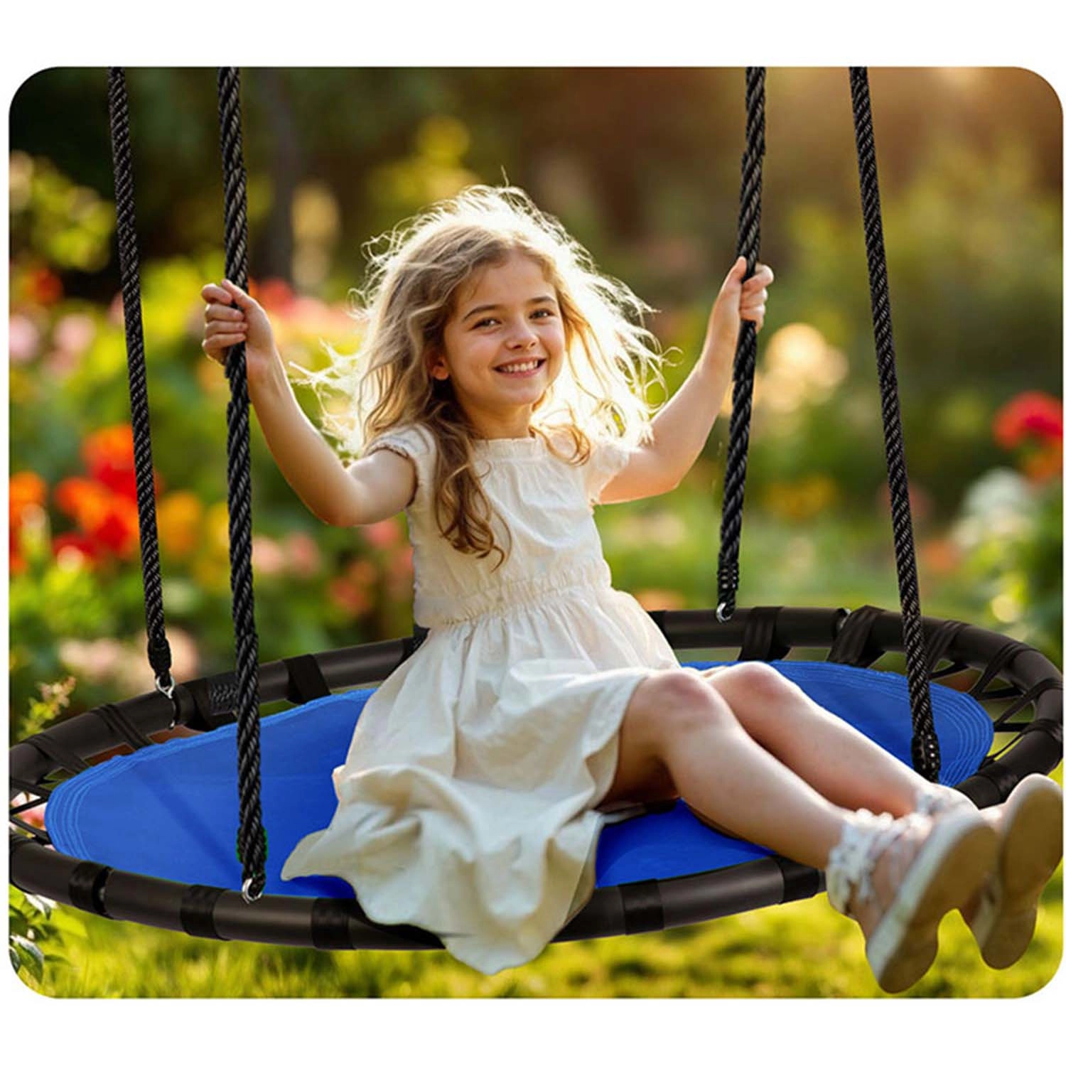 Viseći krug tipa lastavičje gnijezdo NEO-SPORT Swingo idealan je za vrt, terasu i dječje igralište. Široko i stabilno sjedalo od materijala Oxford 600D je vodootporno i lako se čisti, pa podnosi svakodnevnu vanjsku upotrebu. Robustan čelični okvir s PE pjenastim podstavama i jaka poliesterska užad osiguravaju visoku stabilnost i sigurnost pri ljuljanju.