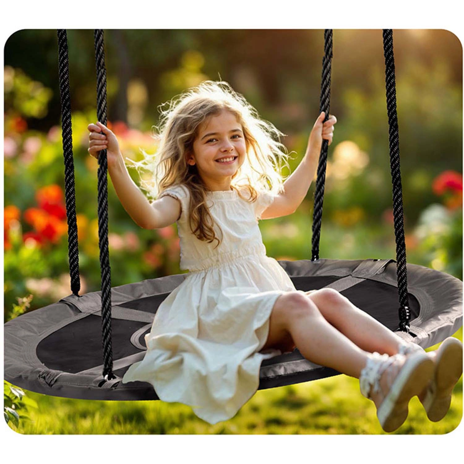 Vješanje u četiri točke i čvrsta pletena užad osiguravaju stabilnost i sigurnost. Visina se jednostavno podešava prema potrebama i visini djeteta, pa ljuljačka doslovno rastu zajedno s njim. Širok promjer od 100 cm pruža dovoljno prostora za sjedenje i ležanje te jamči maksimalnu udobnost.