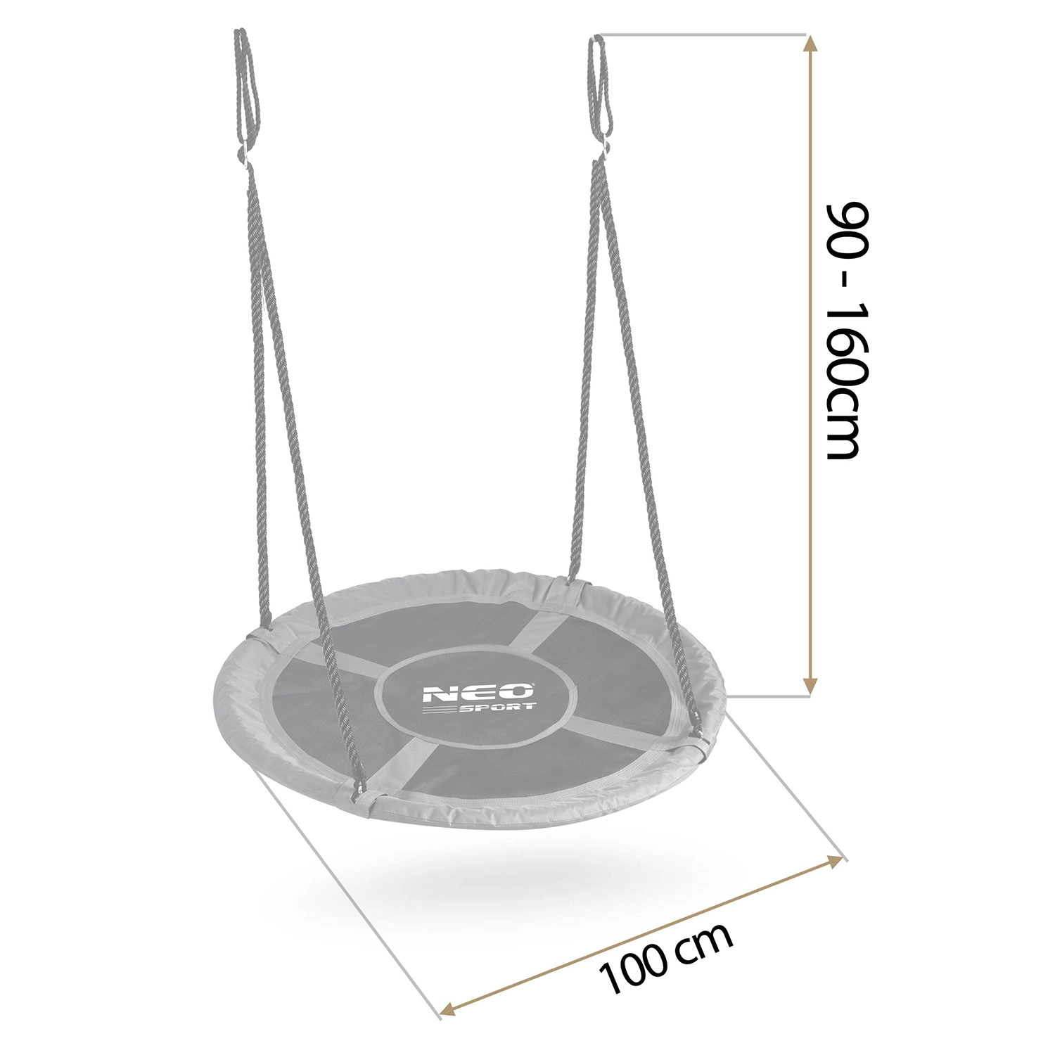 Kružna ljuljačka NEO-SPORT Swingo 100 cm odličan je izbor za vrt, terasu ili dječje igralište. Robustan čelični okvir obložen mekom pjenom štiti pri ljuljanju, dok je izdržljivo sjedište od materijala Oxford 600D vodootporno i lako se čisti. Zahvaljujući visokoj nosivosti pogodna je za mlađu i stariju djecu – a podnosi i zajedničko ljuljanje.