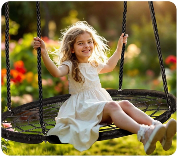 Uživajte u satima zabave na otvorenom s okruglom ljuljačkom tipa „rodičje gnijezdo” promjera 100 cm. Izdržljiva čelična konstrukcija s PE opletom, čvrsta mreža od užeta i podesiva visina ovjesa osiguravaju sigurnost, stabilnost i dug vijek trajanja. Jednostavno se čisti, otporna je na vodu i UV zračenje te nosi do 150 kg – idealna za djecu i odrasle.