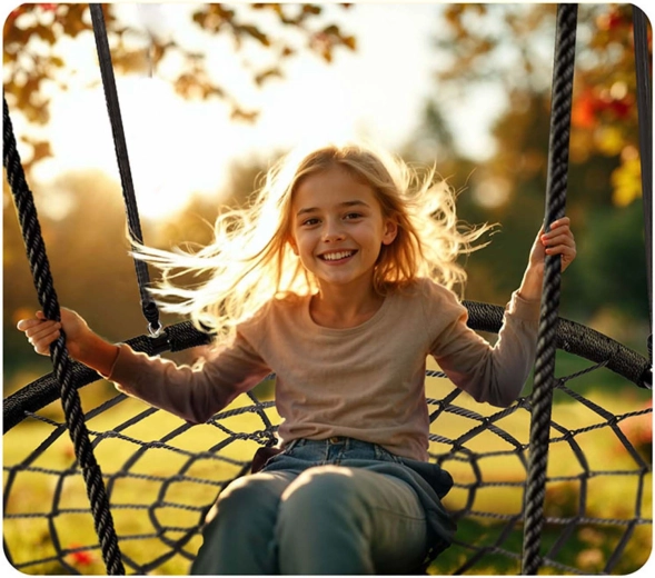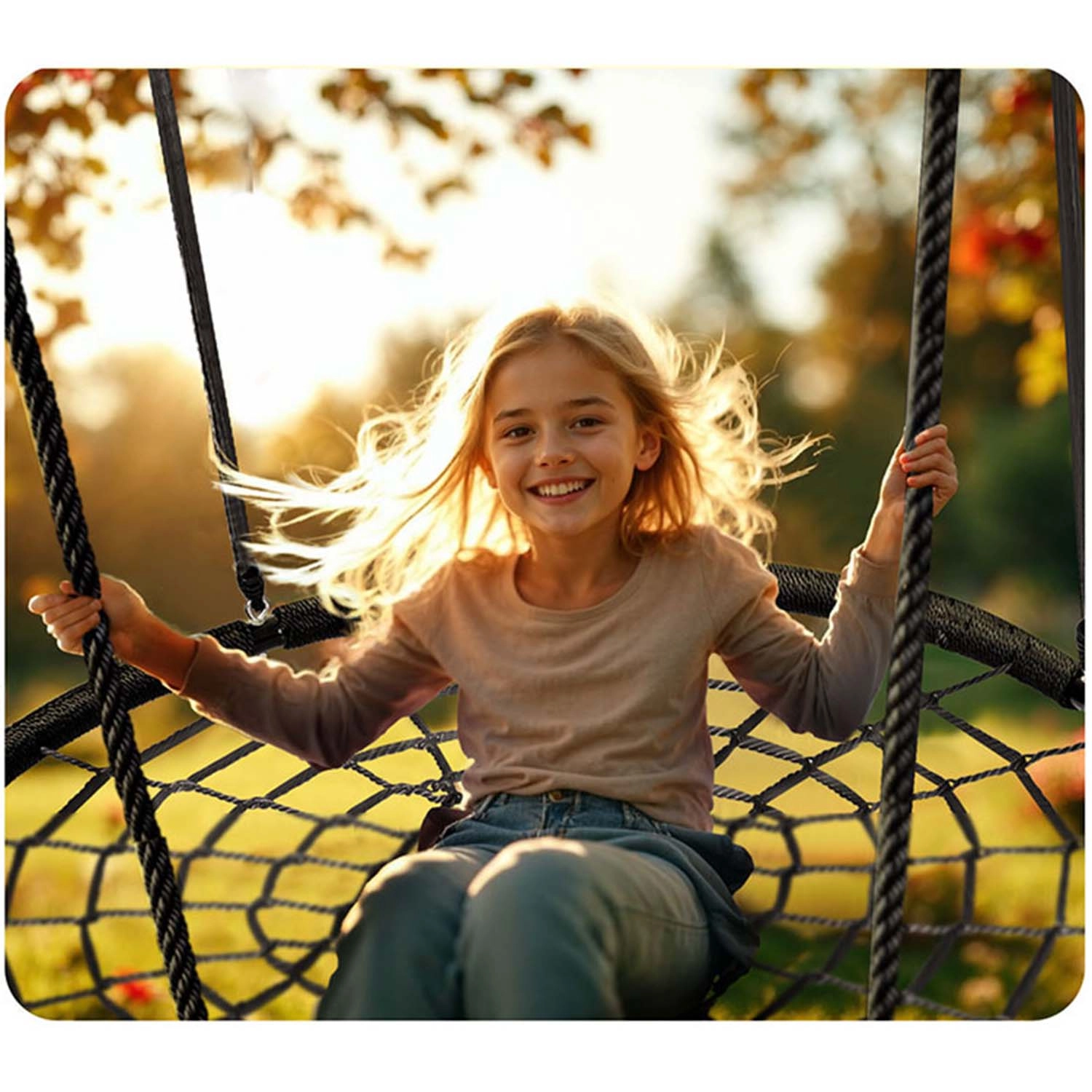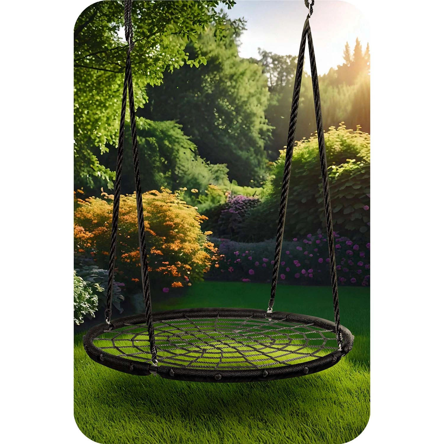 Po visini podesiva ovjesna užad (oko 90–160 cm) omogućuju prilagodbu ljuljačke dobi i visini djeteta. Prostrano sjedište promjera 120 cm udobno prima više djece odjednom, a nosivost do 150 kg nudi sigurno ljuljanje i za odrasle. Idealno rješenje za vrt, dvorište ili pergolu.