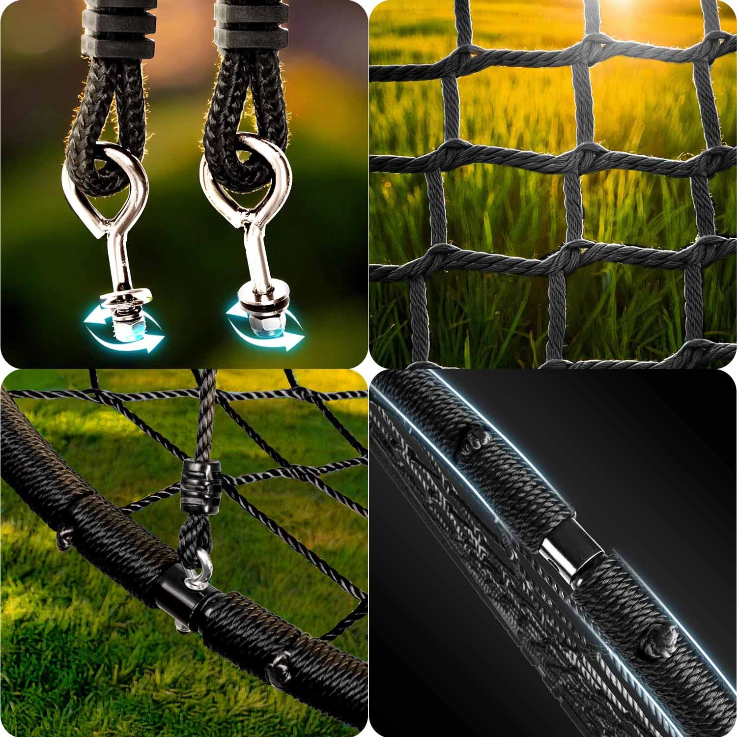 Ova velika kružna ljuljačka gnijezdo donosi djeci i odraslima mnogo zabave i opuštanja. Robustan čelični okvir s PE oblogom i ispuna u stilu „paučine mreže” osiguravaju visoku stabilnost, sigurnost i dugotrajnost. Zahvaljujući lakim za čišćenje i vodootpornim materijalima, ljuljačka ostaje lijepa i funkcionalna kroz cijele sezone.