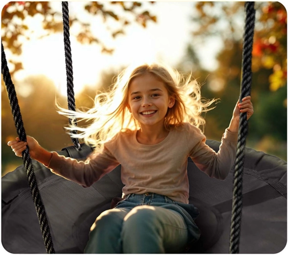 Zahvaljujući podesivim visećim užadima s maksimalnom duljinom 160 cm lako ćete prilagoditi visinu ljuljačke visini djeteta i mjestu vješanja. Široka sjedna površina udobna je za sjedenje i ležanje, pa će u ljuljanju uživati i manja i veća djeca – a bez problema i odrasli.