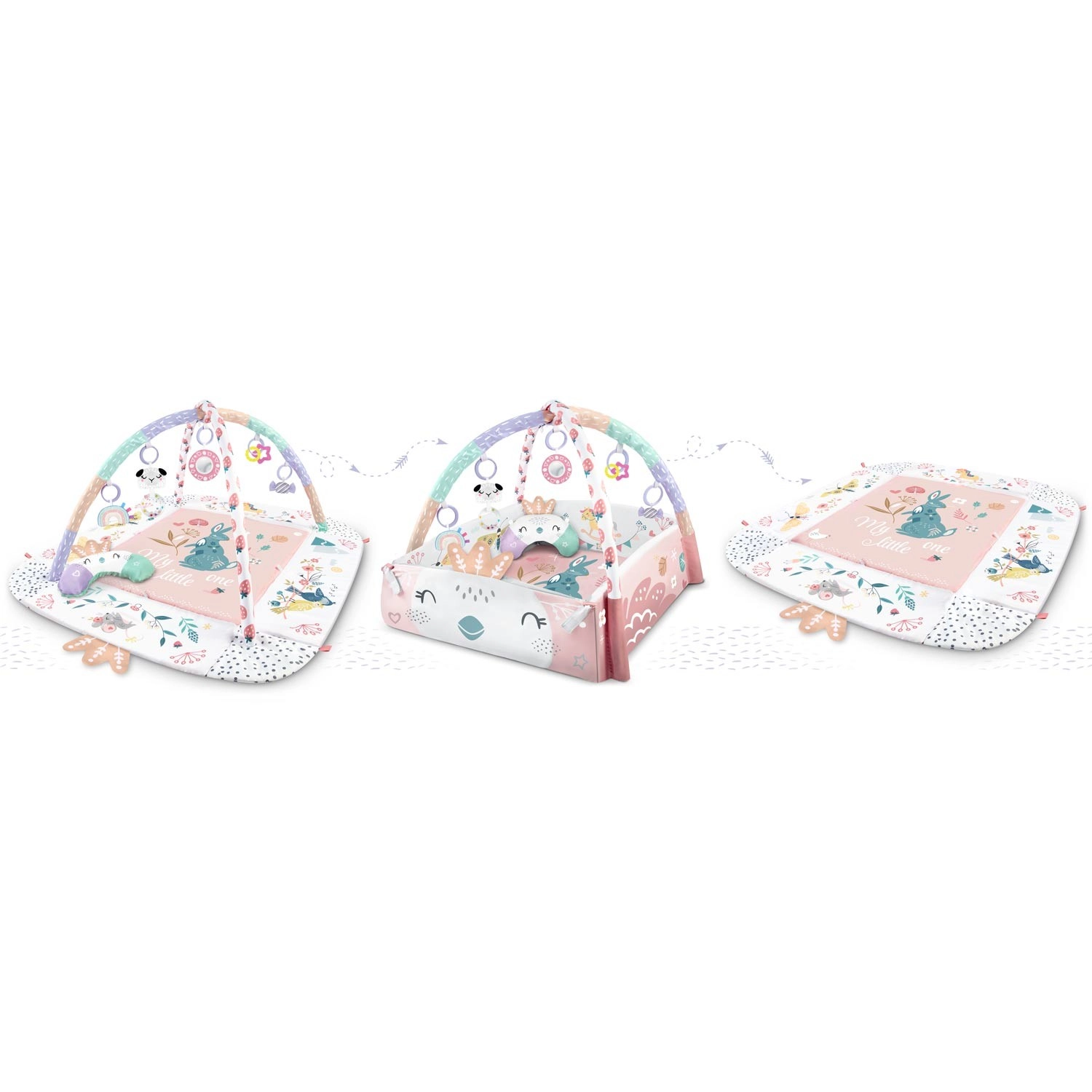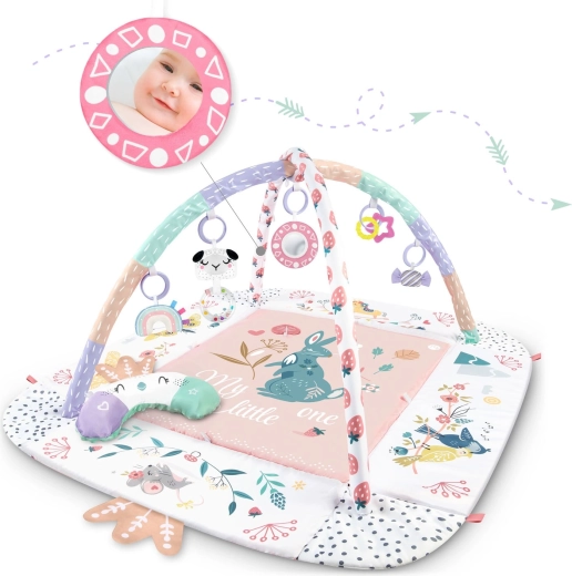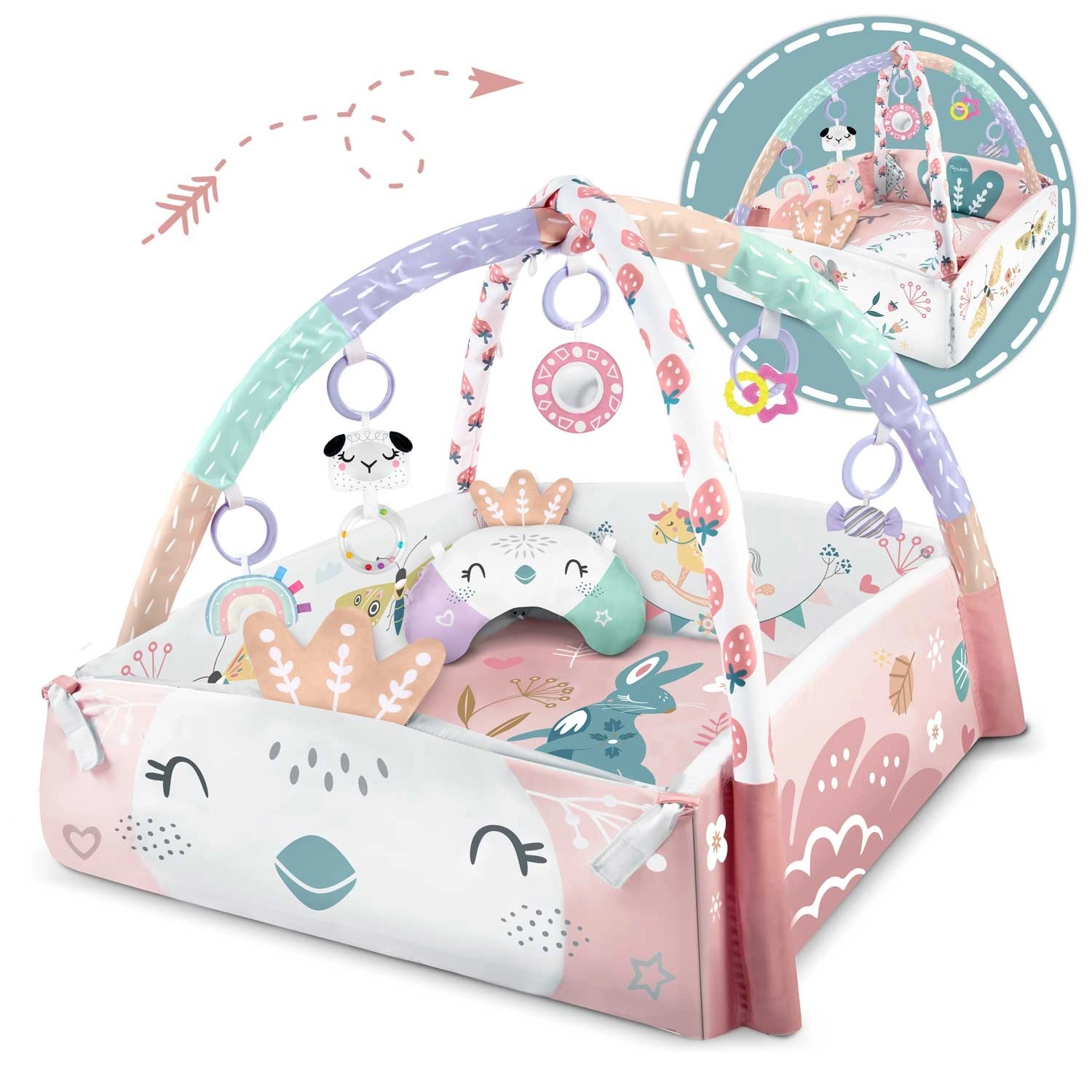 Materijal je mekan, izdržljiv i lako se čisti, donja strana odlično izolira od hladnoće. Pastelna, obostrana grafika s motivom životinja stvara ugodno okruženje za svakodnevnu igru i odmor. Zahvaljujući odvojivim i po visini podesivim prečkama te pametnim čičak-trakama igračke je lako premještati i prilagoditi fazi razvoja djeteta.