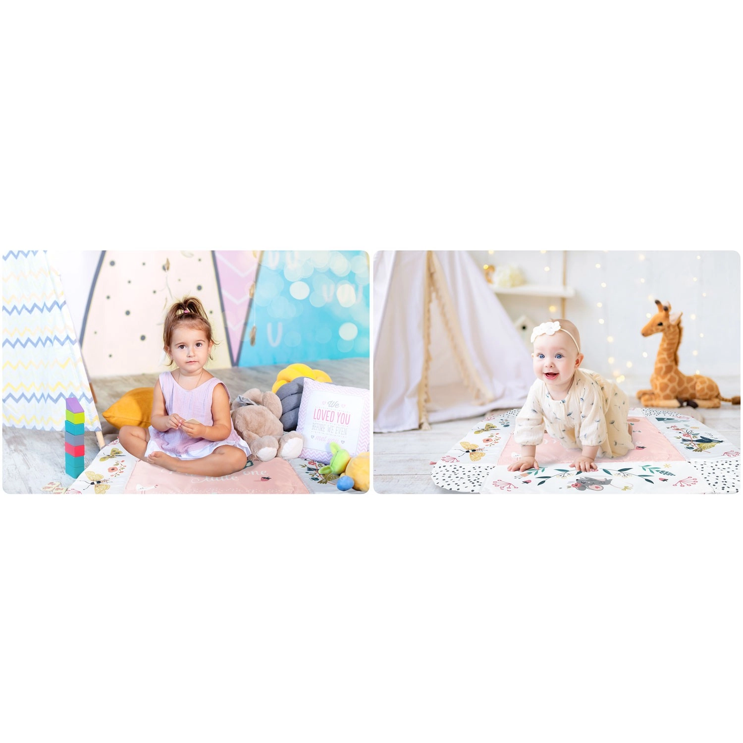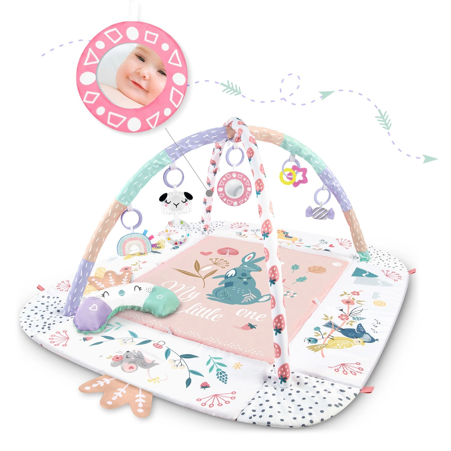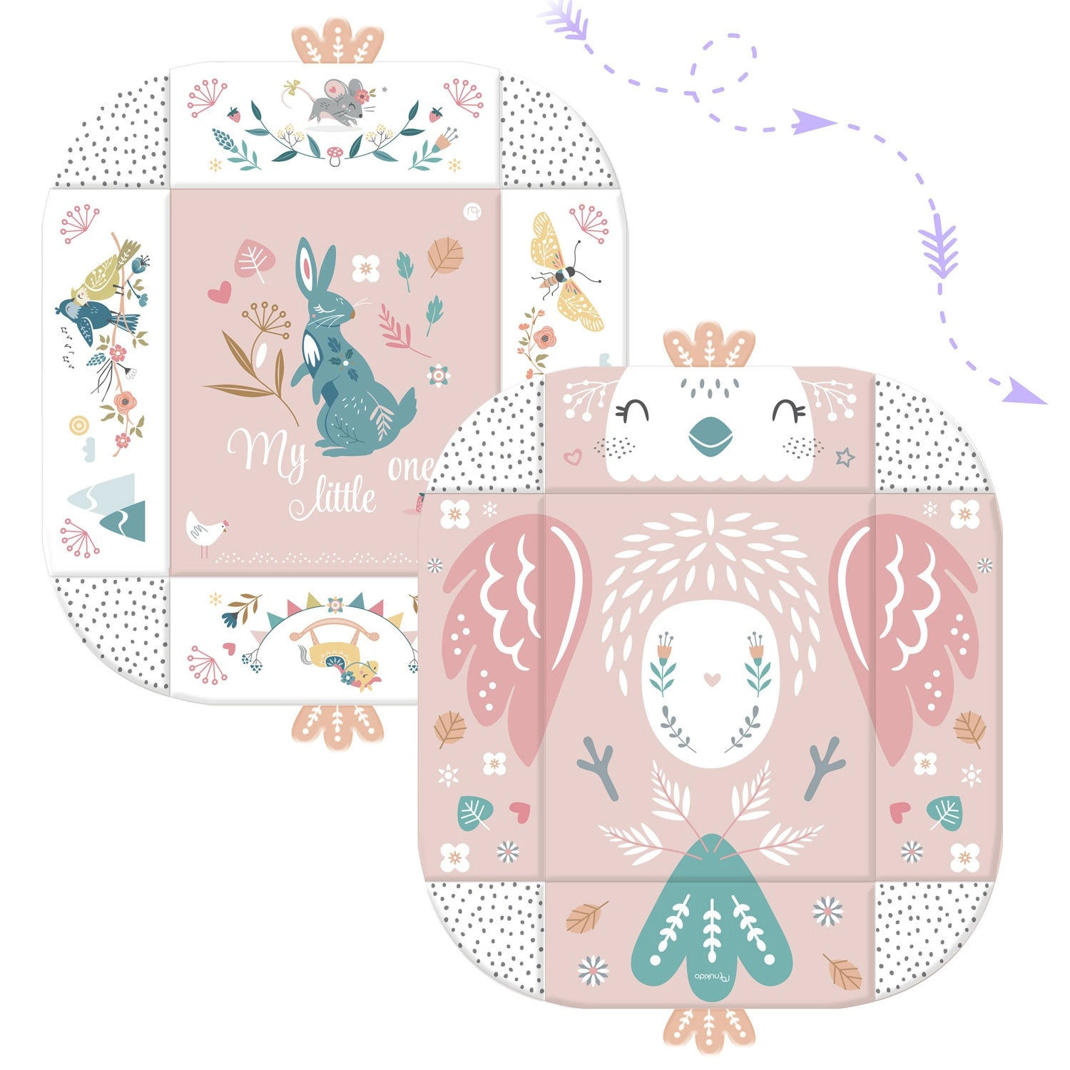 Materijal je mekan, izdržljiv i lako se čisti, donja strana odlično izolira od hladnoće. Pastelna, obostrana grafika s motivom životinja stvara ugodno okruženje za svakodnevnu igru i odmor. Zahvaljujući odvojivim i po visini podesivim prečkama te pametnim čičak-trakama igračke je lako premještati i prilagoditi fazi razvoja djeteta.