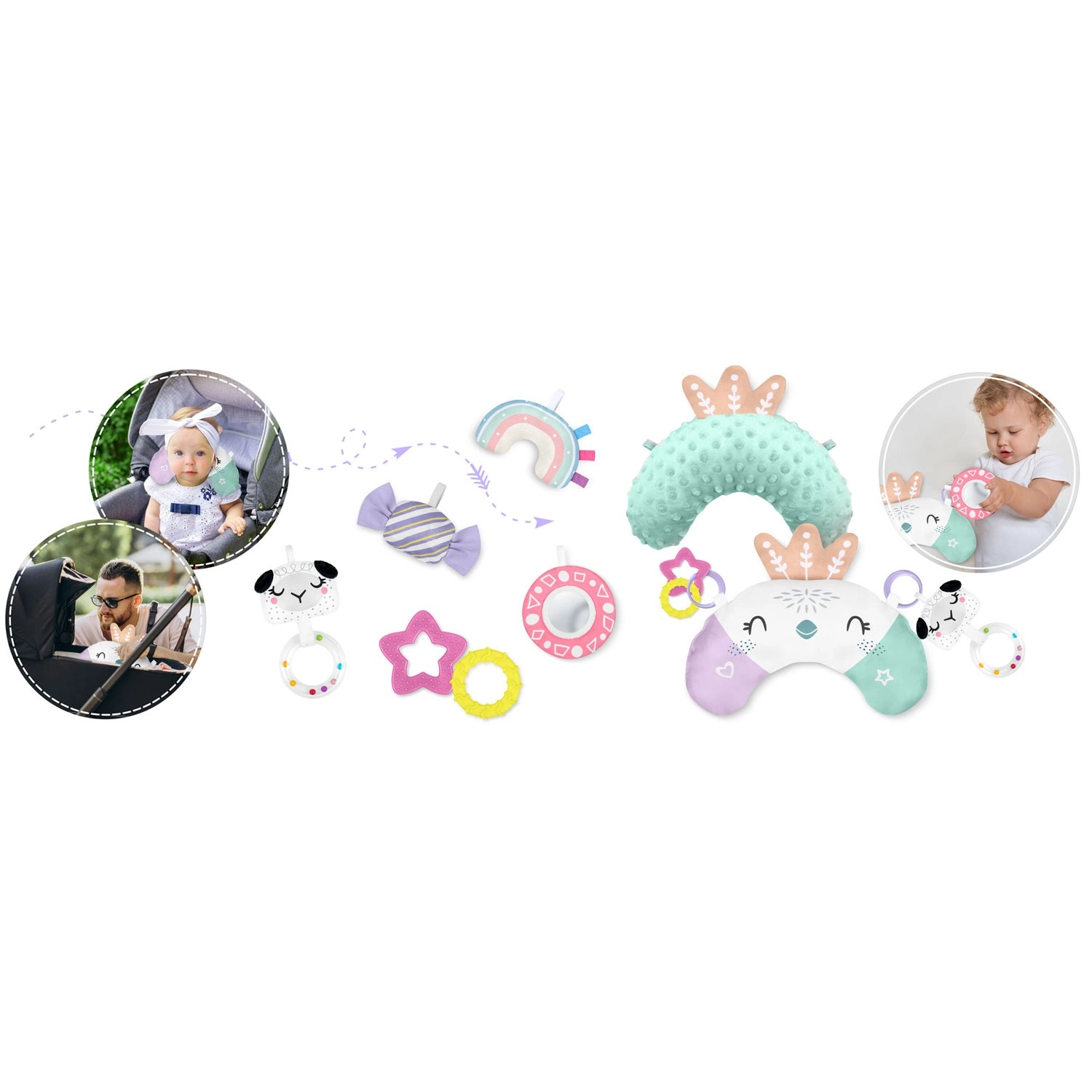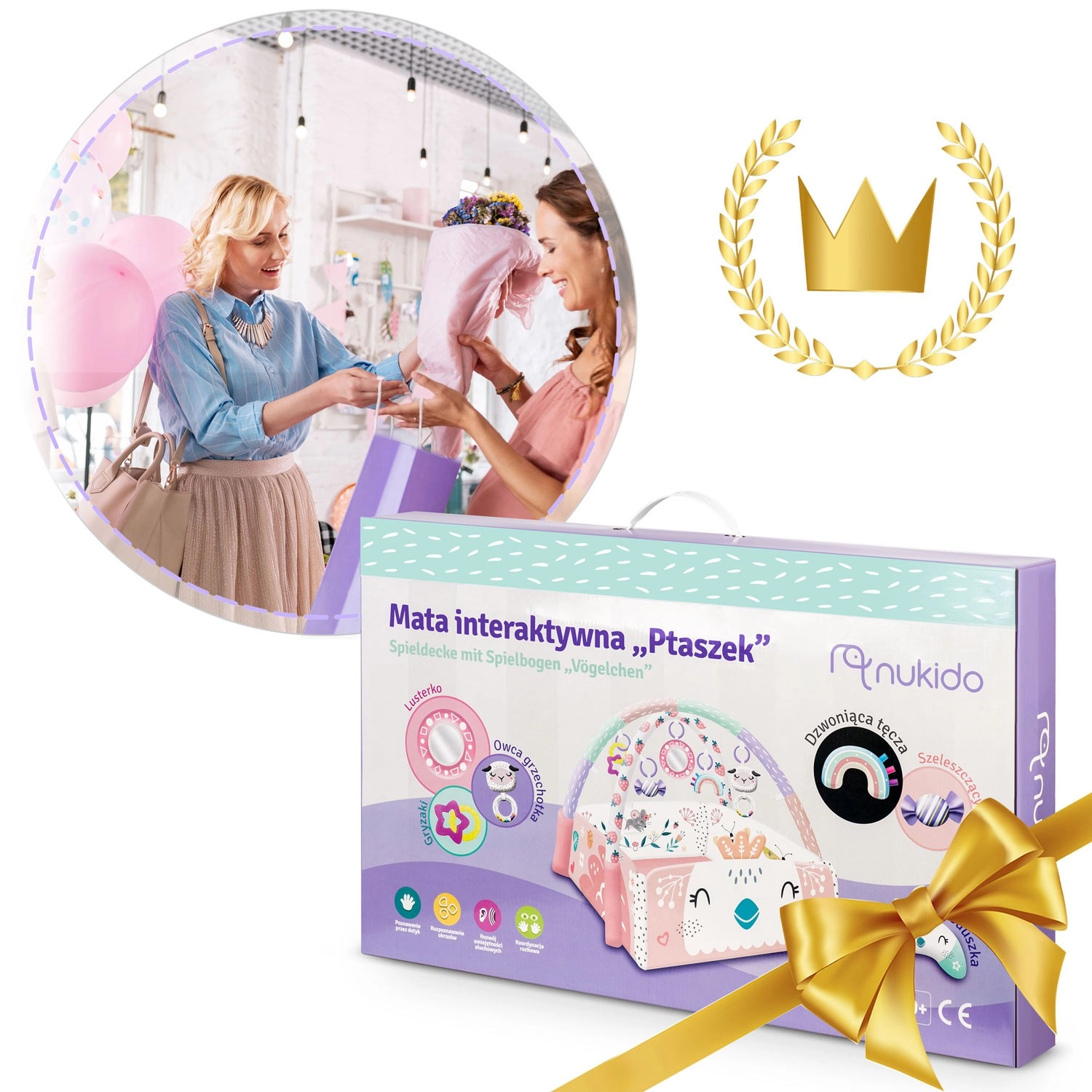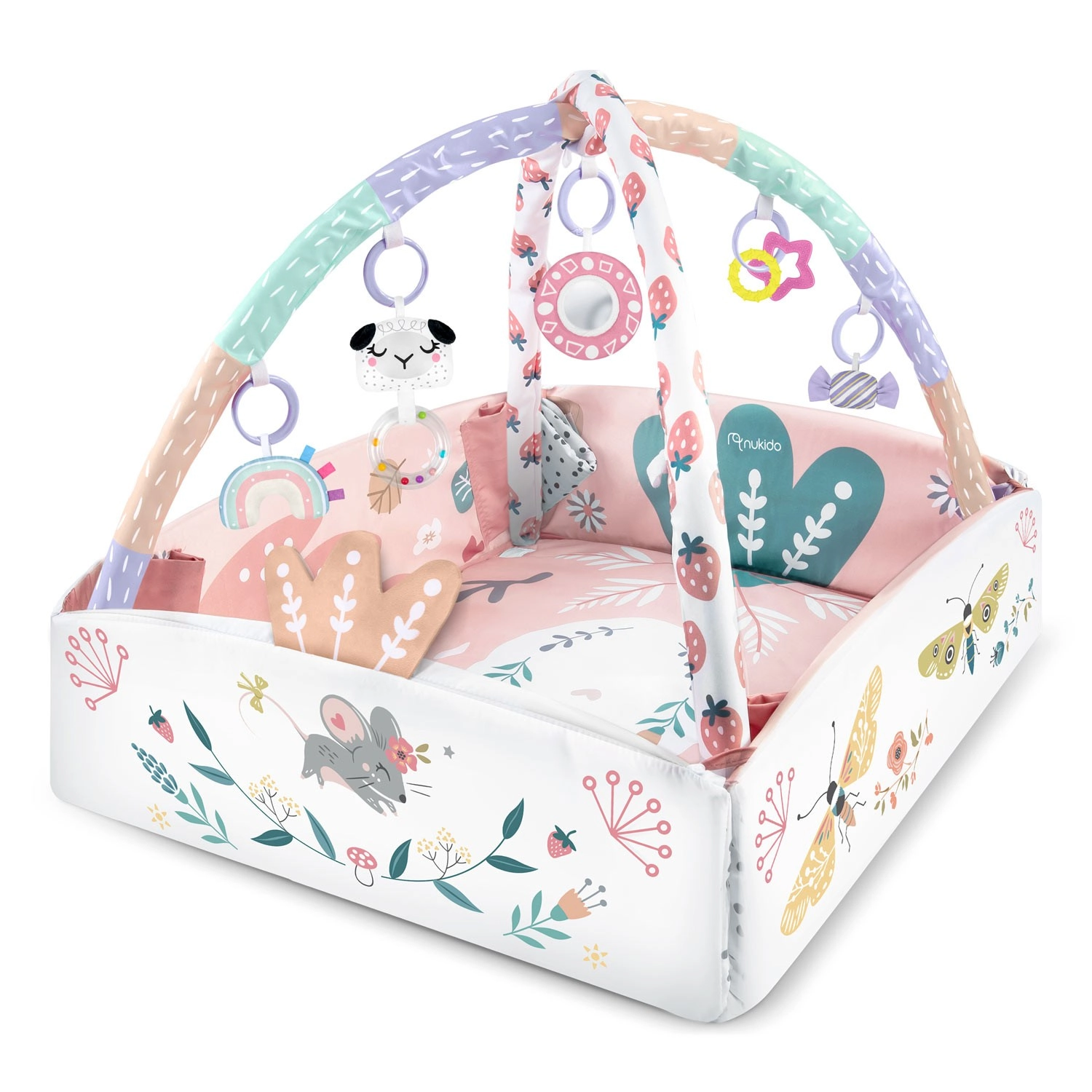 Otkrijte univerzalnu podlogu za igru NUKIDO koja raste s vašom bebom. Podloga se može koristiti u 3 konfiguracije – kao otvorena podloga, s preklopnim bočnim stranicama za sigurniji kutak za igru te kao ugodan prostor za prva sjedenja i igru. 7 visećih igračaka (zrcalce od nelomljivog materijala, zvečkice, šuškavi i piskavi elementi, grickalice) stimulira vid, sluh i dodir te potiče finu motoriku.
