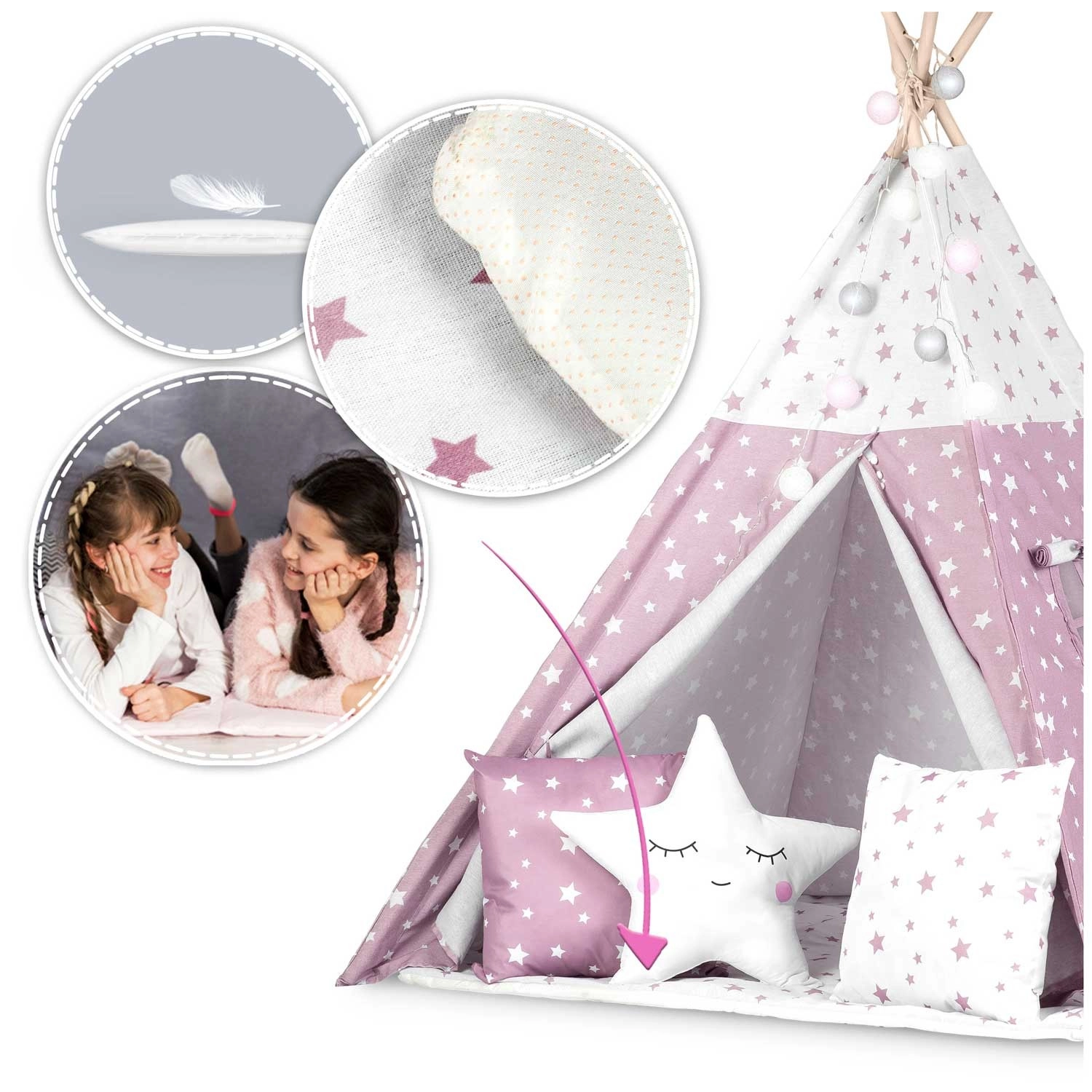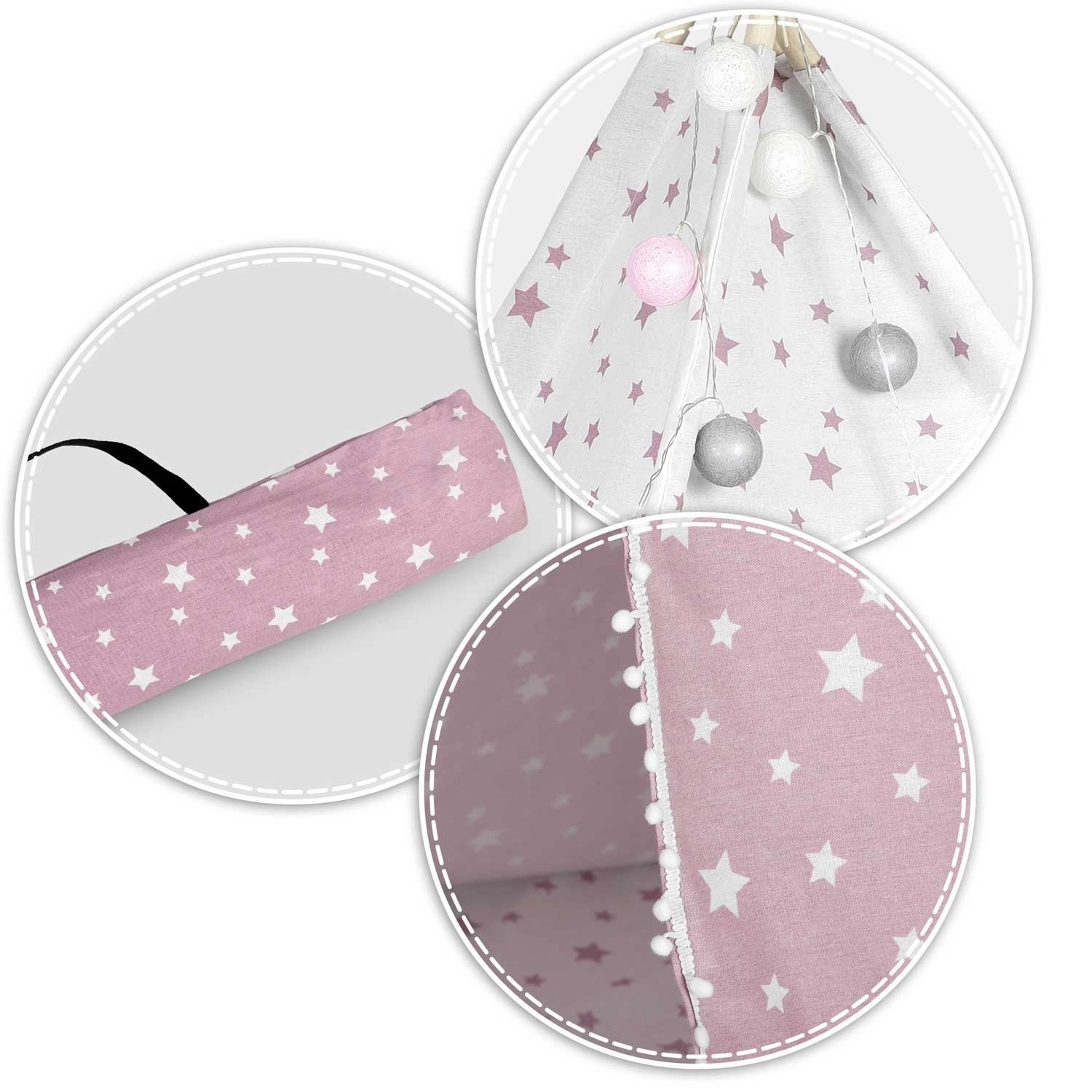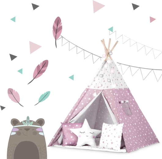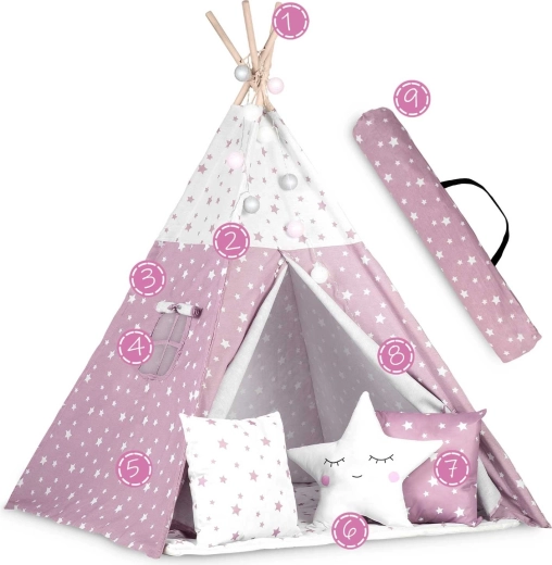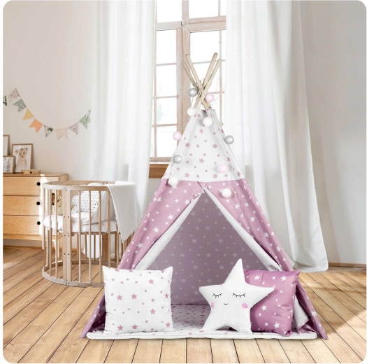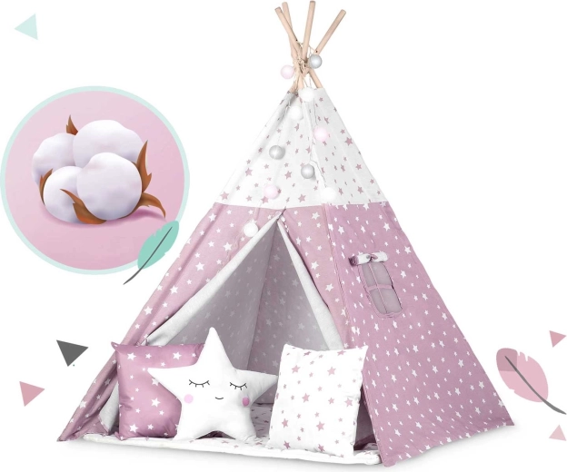 Dječji teepee NUKIDO u ružičastoj boji sa zvjezdicama lijep je i funkcionalan element dječje sobe. Šivan od premium 100% pamuka više gramature 175 g/m² za ugodan dodir, prozračnost i dugi vijek trajanja. Stabilna smrekova/borova konstrukcija s četiri letve dopunjena je stabilizatorom za sigurniju upotrebu. Otvoreni ulaz s vezicama i prozorčić s roletom daju teepeeu razigranost i bolju cirkulaciju zraka.