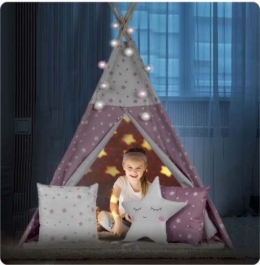 Dio pakiranja je mekana izolacijska podloga s protukliznim točkicama i tri dekorativna jastučića koji osiguravaju udobnost pri čitanju ili odmoru. Zahvaljujući LED svjetlima na baterije u trenu ćete stvoriti čarobnu atmosferu. Teepee se lako sklapa, prenosi i zahvaljujući priloženom etuiu možete ga pospremiti ili ponijeti na terasu ili u hlad na vrtu.