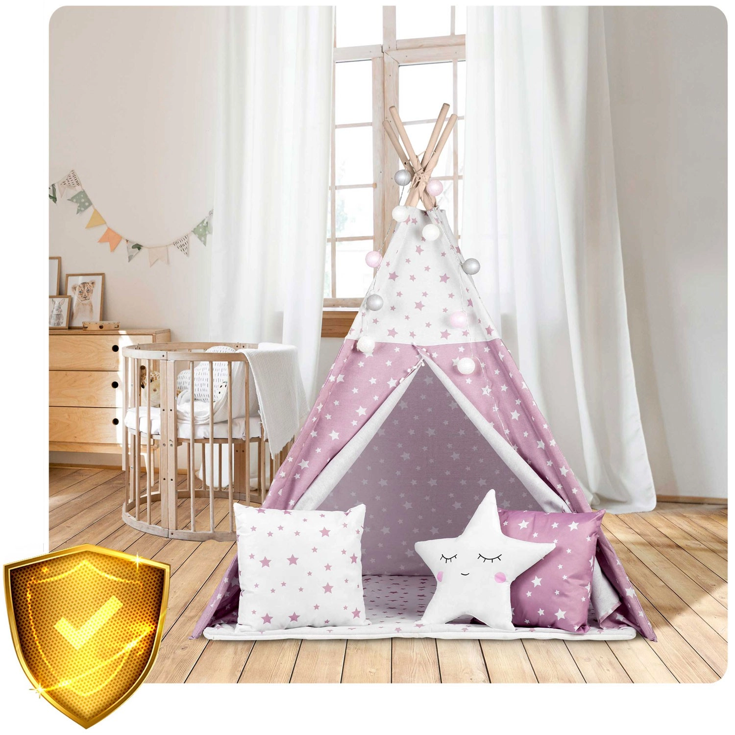 Četiri drvene letve od bora čine čvrst okvir. Priloženi stabilizator povećava sigurnost i održava teepee u optimalnom obliku tijekom igre.