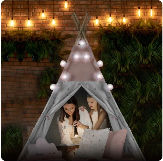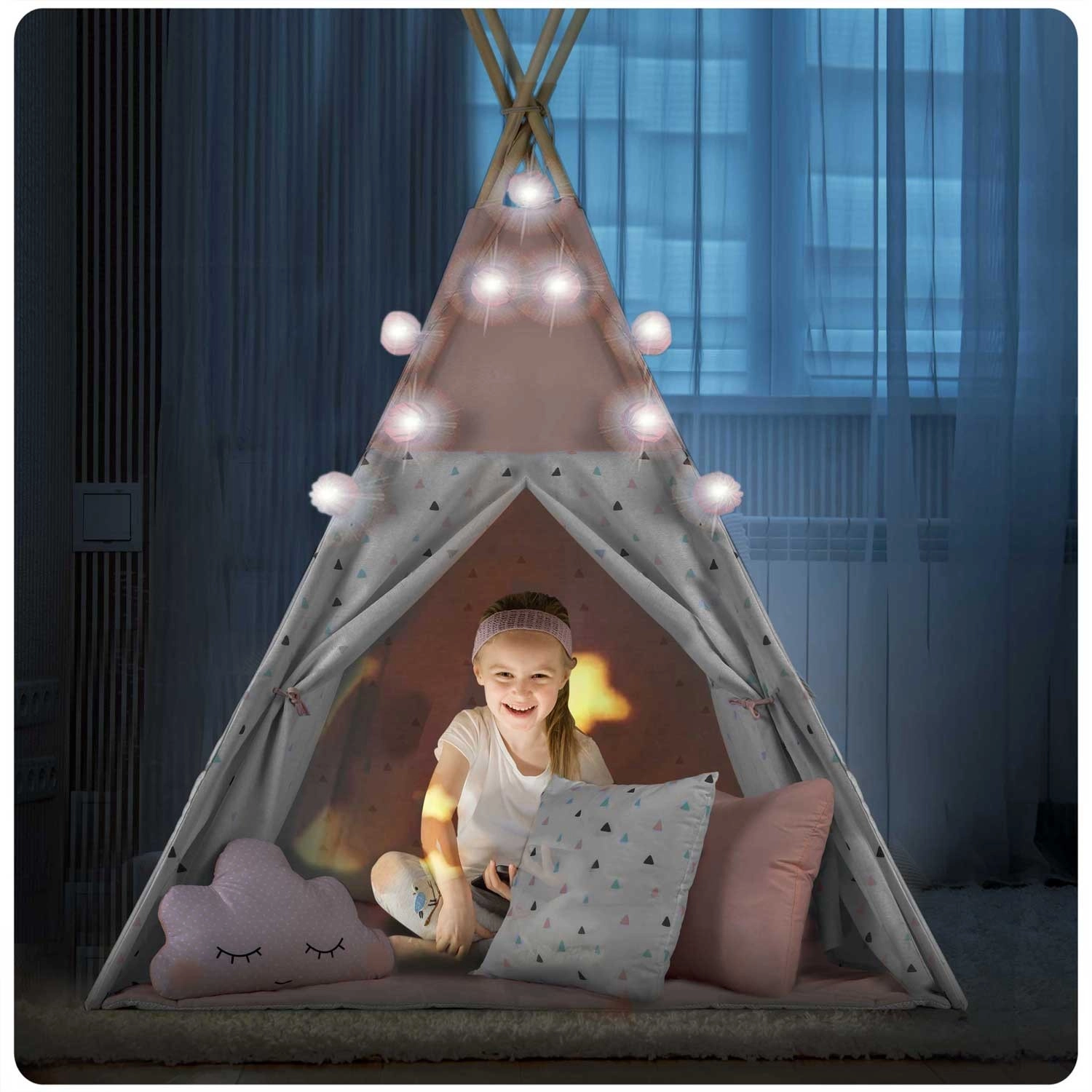 U pakiranju su 3 dekorativna jastučića, mekana izolacijska podloga s protuklizom, girlanda, lampice i torba. Sve što trebate za brzo stvaranje čarobnog kutka.