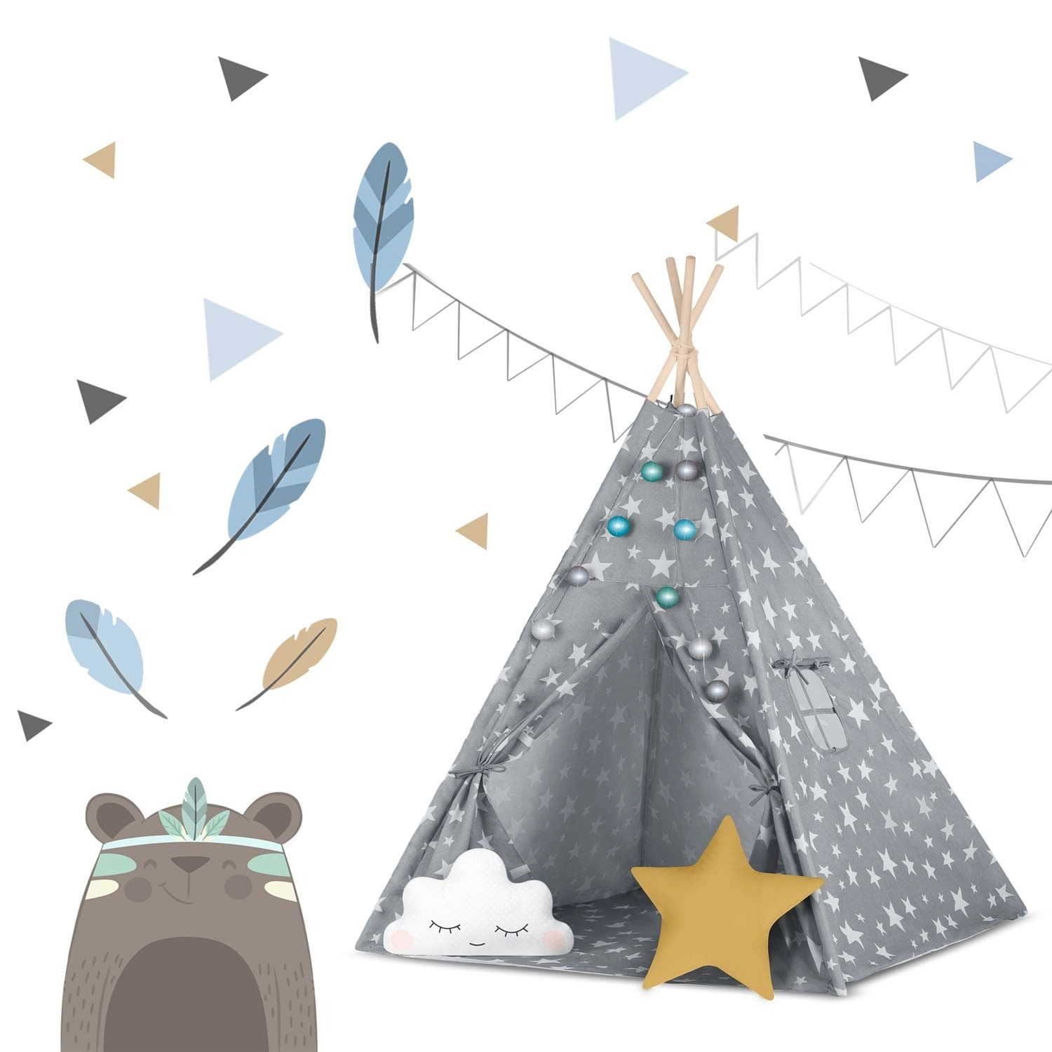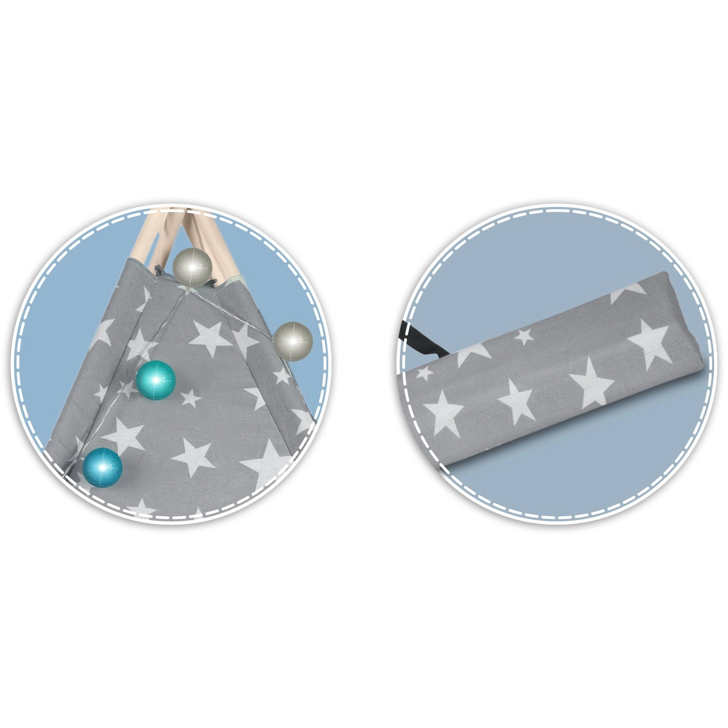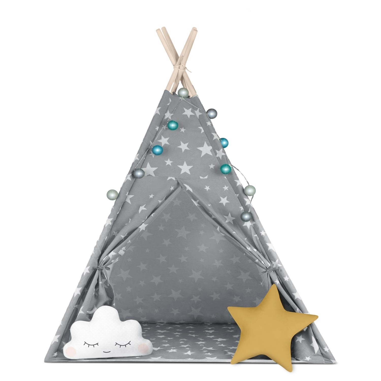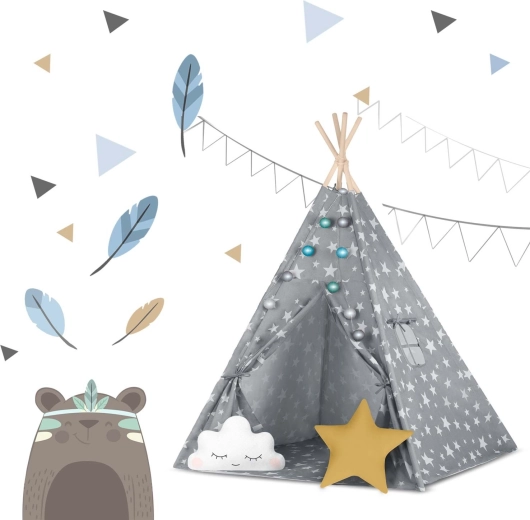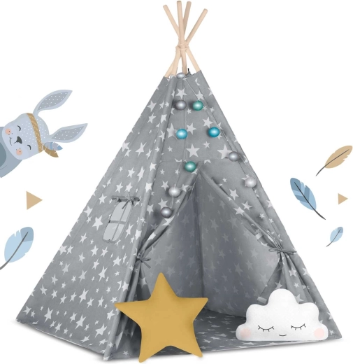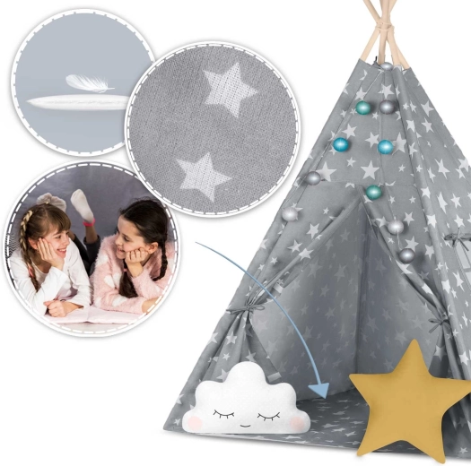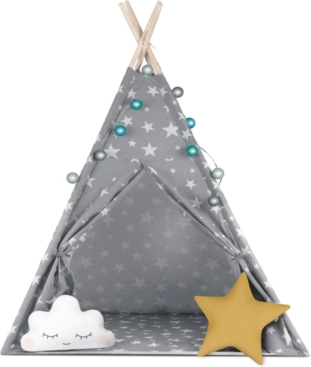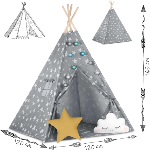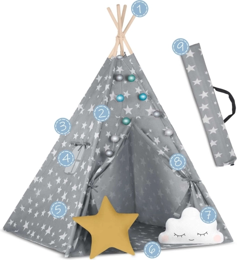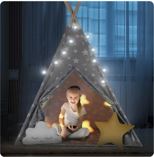 U paketu je sve što trebate: 4 borove letve, stabilizator za dodatnu čvrstoću, LED svjetla (na baterije), ušivena podloga, 2 mekana jastučića u obliku oblaka i zvijezde, prozorčić s roletom i praktična prijenosna torba. Teepee se lako sklapa i prenosi – savršen za dječju sobu, igraći kutak i vrt u hladu.