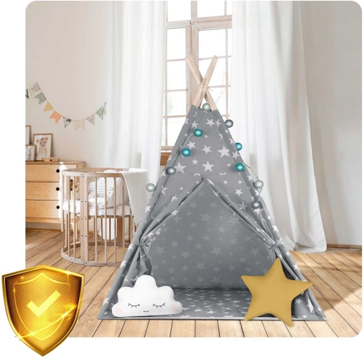 Dječji teepee NUKIDO u elegantnoj sivoj boji sa zvjezdicama dizajniran je u duhu Montessorija – potiče samostalnost, maštu i mirne trenutke za čitanje. Prirodni materijali i kvalitetna izrada osiguravaju sigurnost i udobnost, dok lagani i prozračni premium pamuk održava ugodno okruženje tijekom cijelog dana.