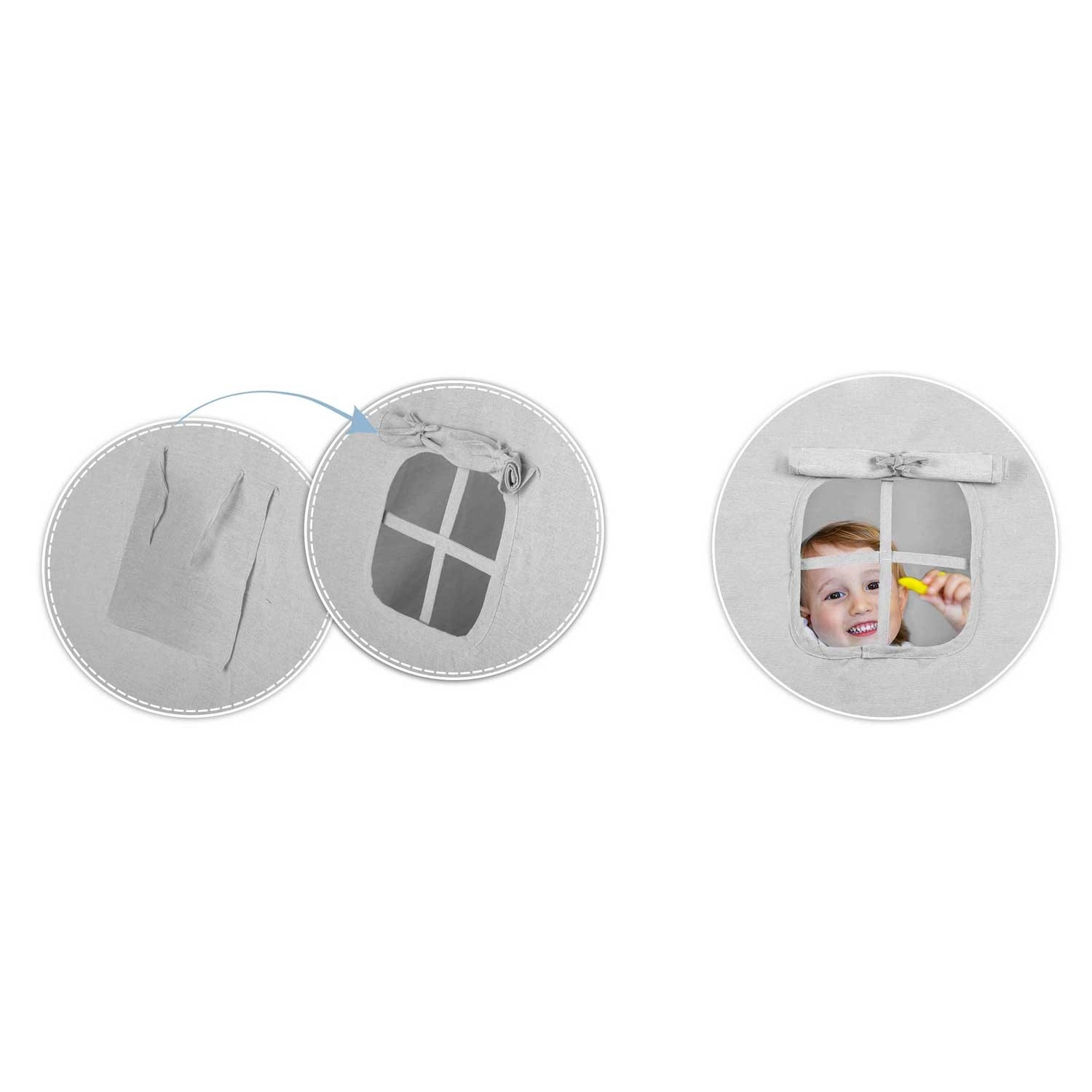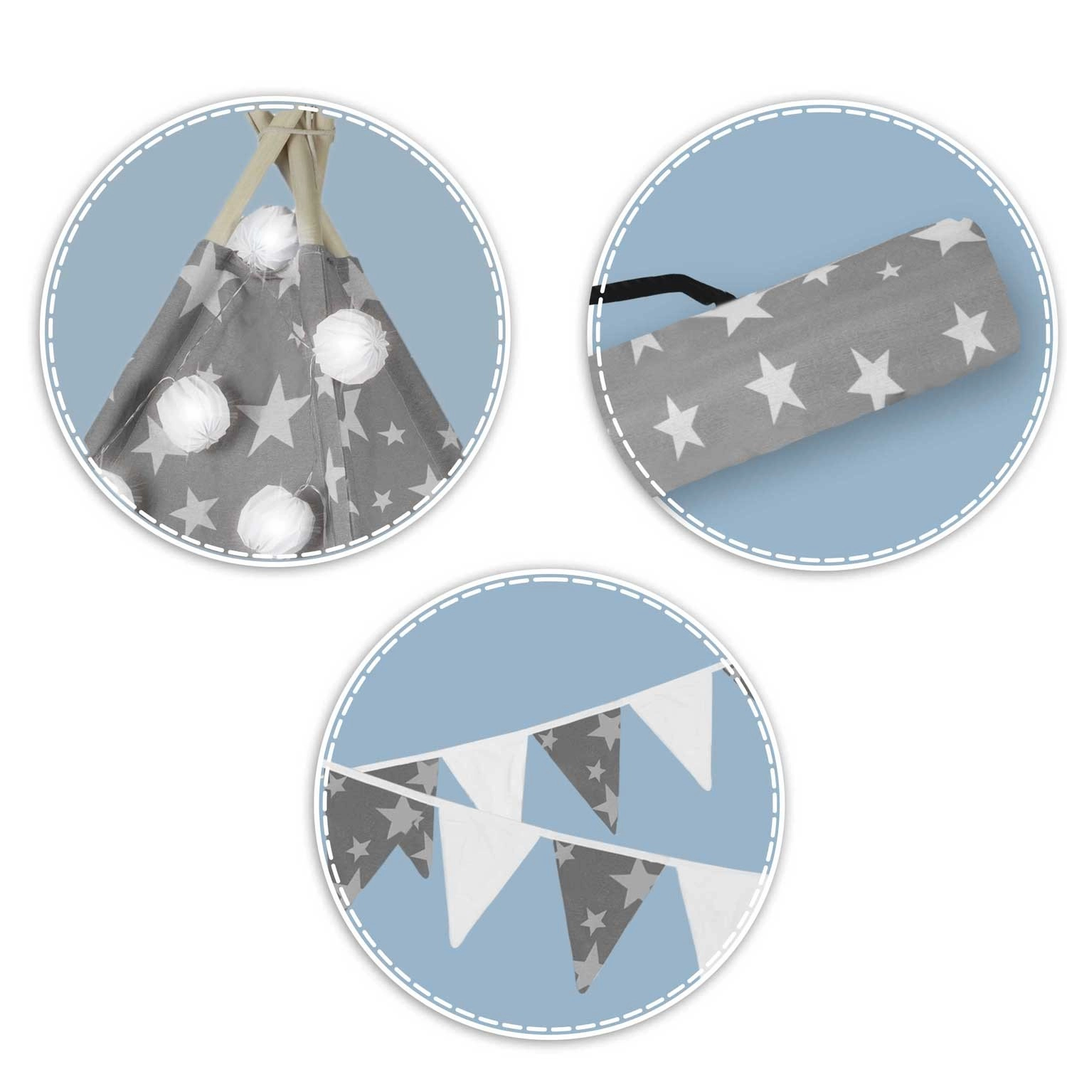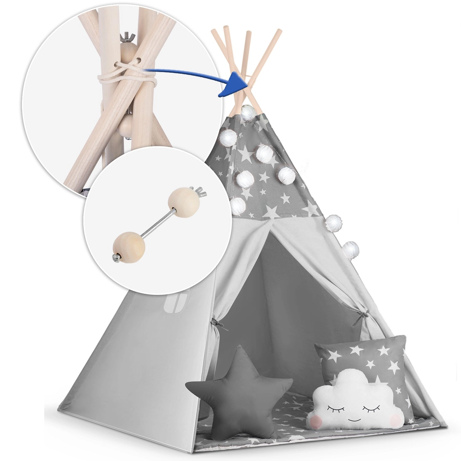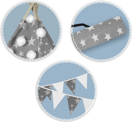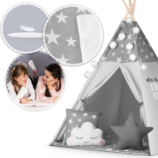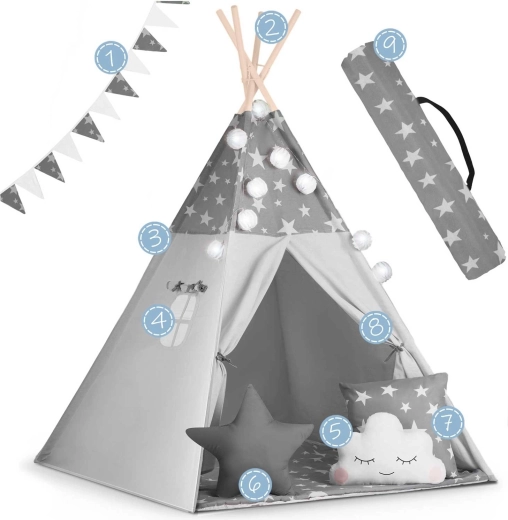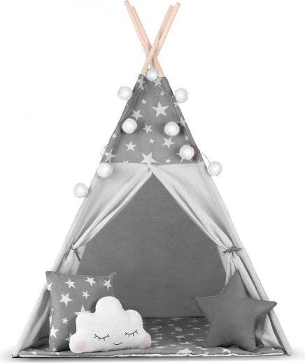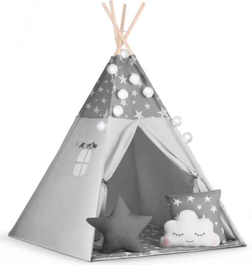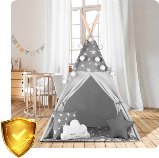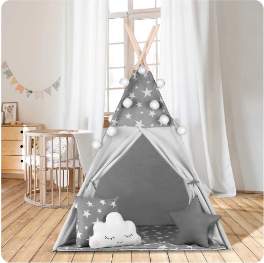Stvorite djeci njihov vlastiti ugodan kutak s teepeejem NUKIDO. Ovaj stilski šator u nježnoj sivoj boji sa zvjezdicama izrađen je od premium pamuka, ima stabilnu drvenu konstrukciju sa stabilizatorom gratis, a u kompletu su mekana izolacijska podloga, 3 jastučića, girlanda, svjetla i transportna torba. Jednostavno se sklapa, izvrsno prozračuje i idealan je za igru, čitanje i odmor u domu i vrtu.