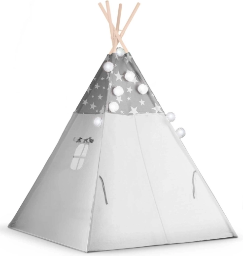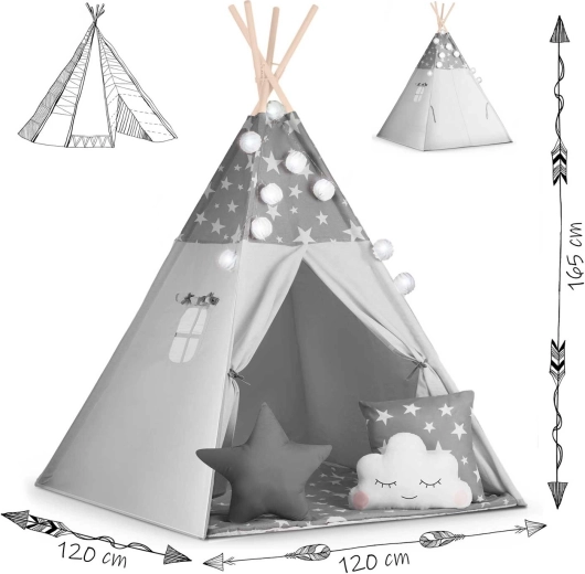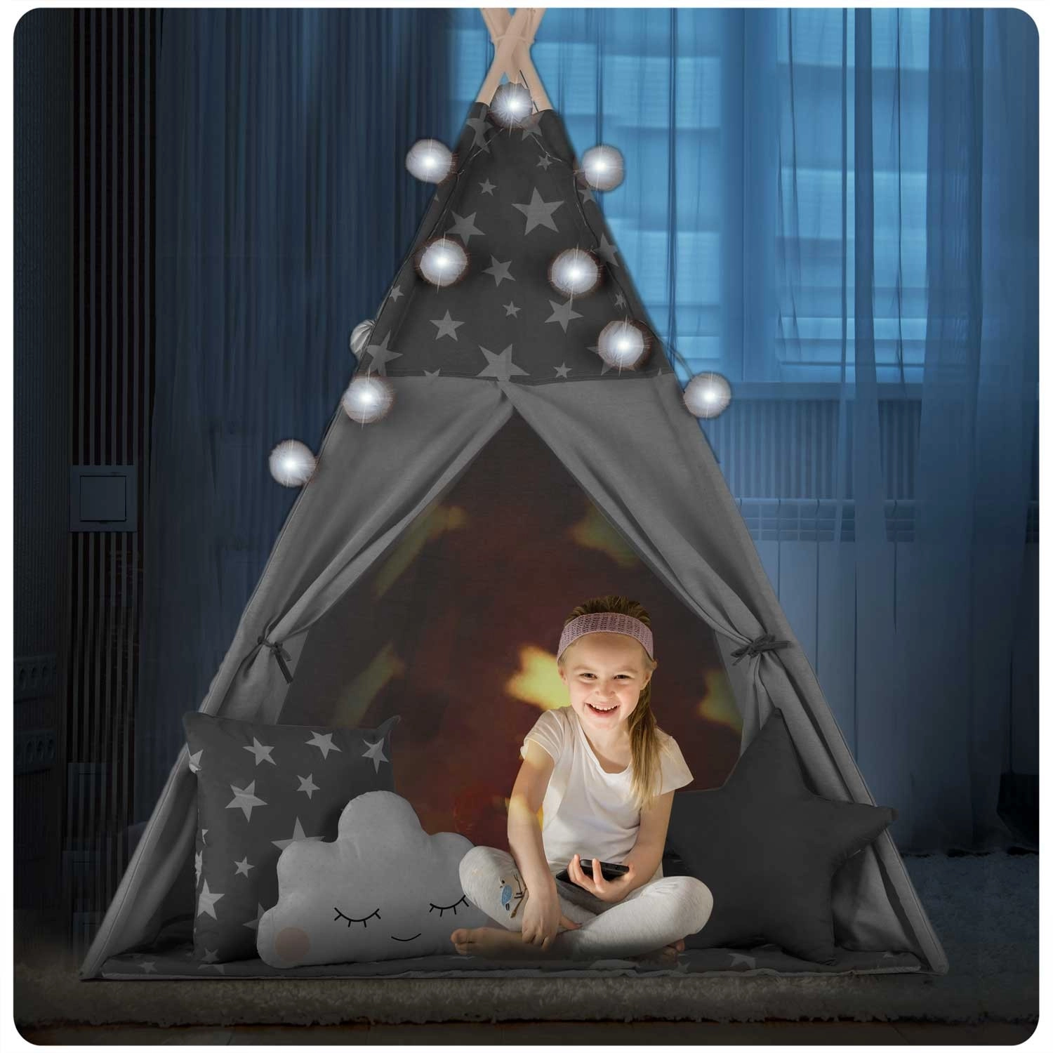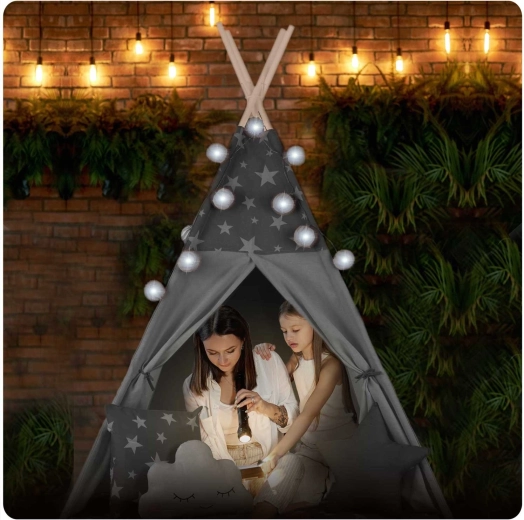 Za maksimalnu udobnost u paketu je podstavljena izolacijska podloga s protukliznom obradom i tri dekorativna jastučića. Za atmosferu se brinu LED svjetla i girlanda, dok rolo prozorčić i vezani ulazi omogućuju igru s prostorom i svjetlom. Nakon sklapanja teepee zauzima minimum mjesta, a u priloženoj torbi lako ga je prenijeti.