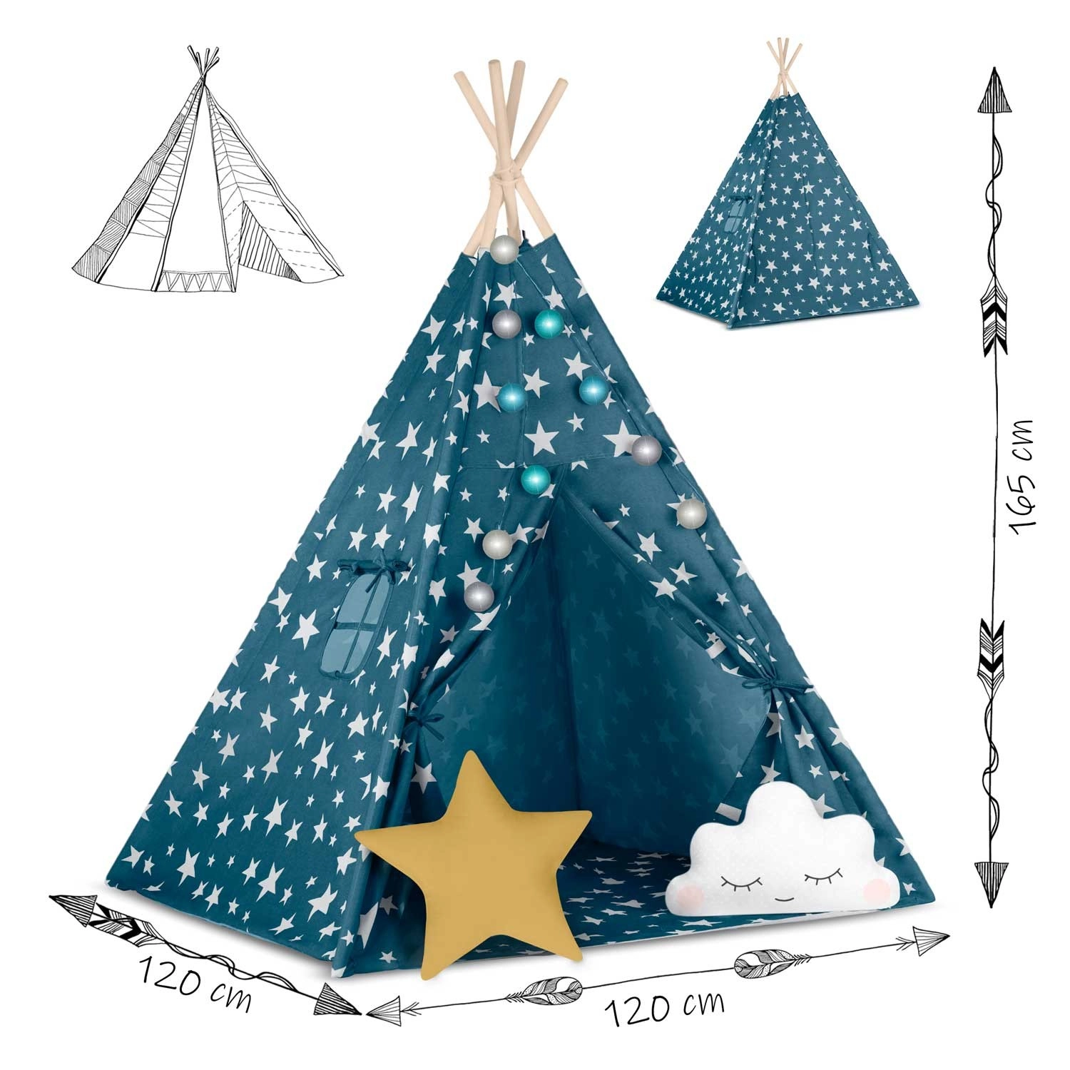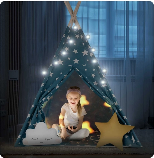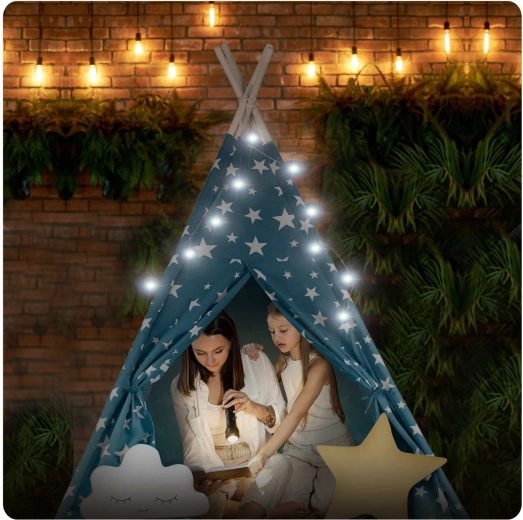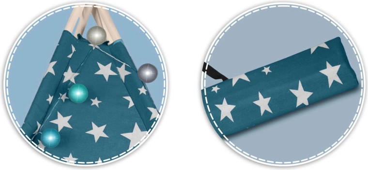 Prozračni 100% premium pamuk (175 g/m²) omogućuje cirkulaciju zraka i odolijeva i najdivljijim pustolovinama. Stabilne borove letve drže konstrukciju sigurnom, a cijeli se teepee brzo sklapa i prenosi – u dnevni boravak, dječju sobu ili u vrt u hlad.