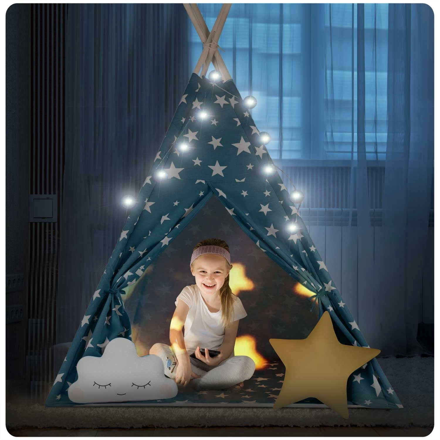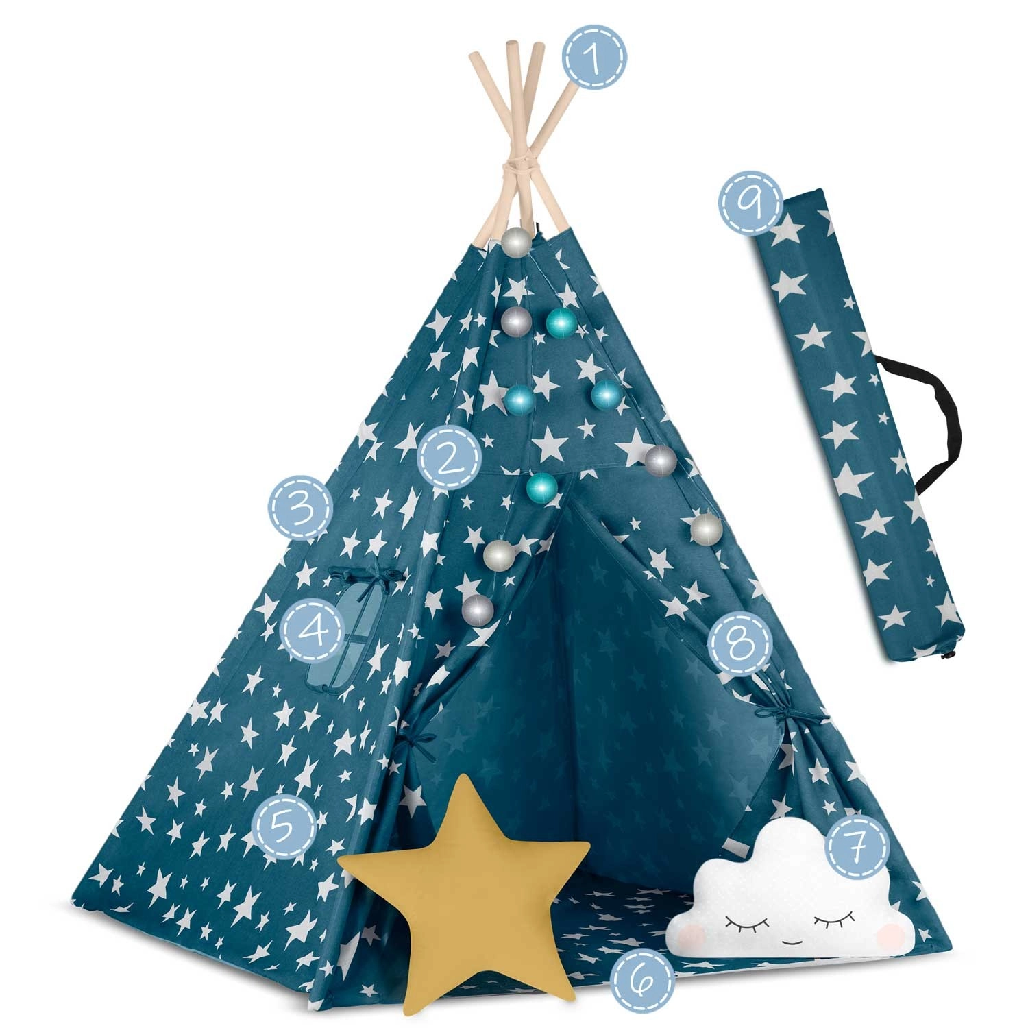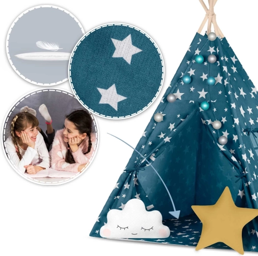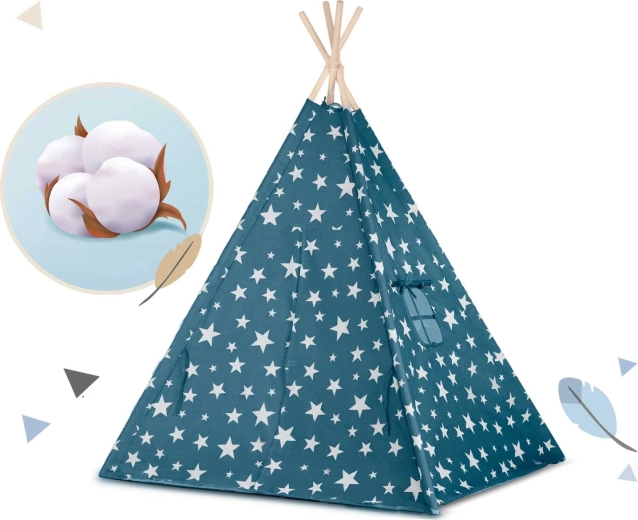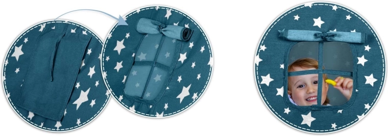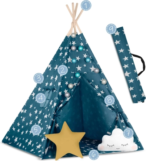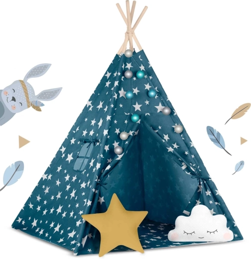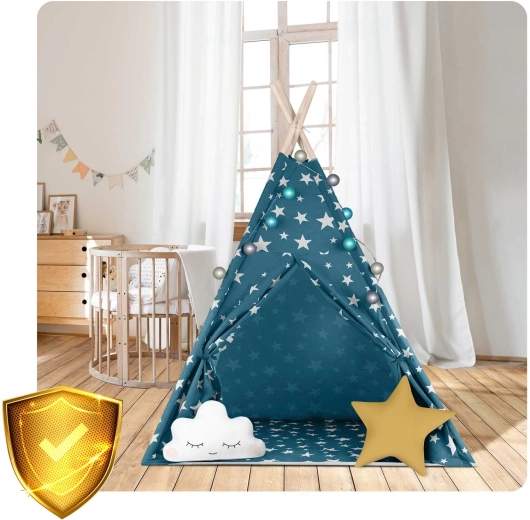 Pružite djeci njihovu vlastitu “baznu stanicu” za igru, čitanje i odmor. Teepee Nukido u nježnoj plavoj boji sa zvjezdicama spaja prirodne materijale, estetski dizajn i funkcionalne detalje – od otvarajućeg prozorčića do vezivih ulaza. Ušivena podloga ostaje na mjestu, a zajedno s dvama mekim jastučićima pruža maksimalnu udobnost.