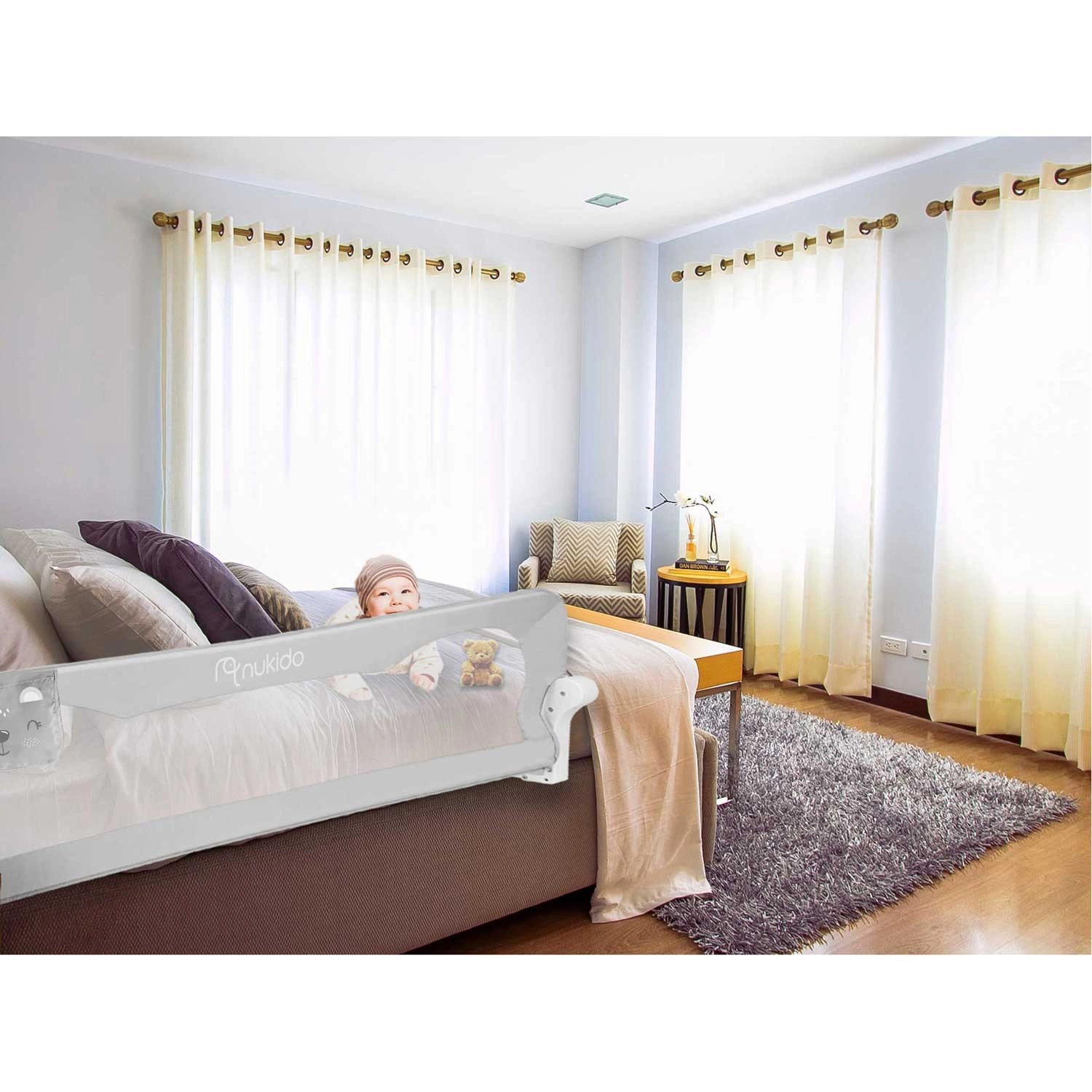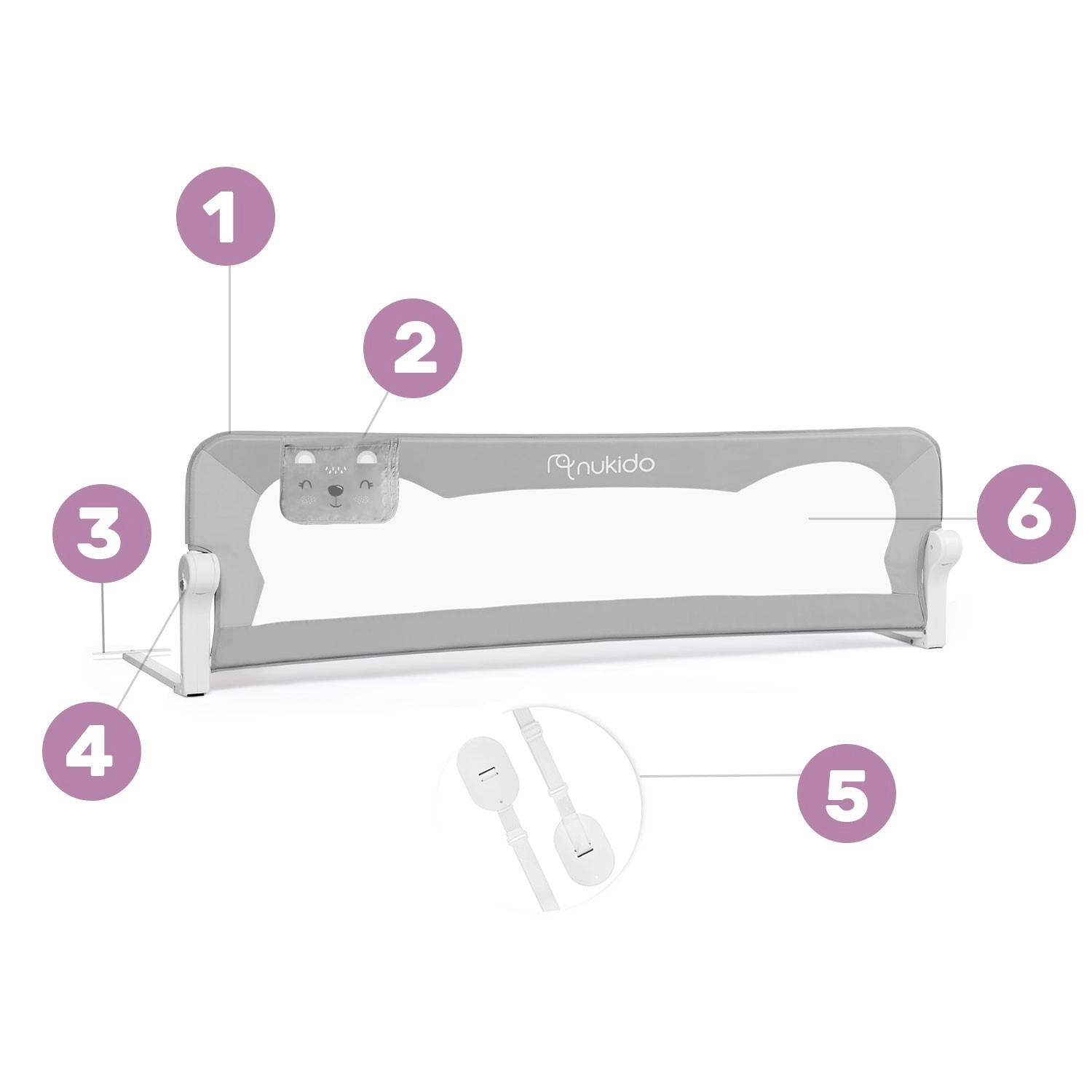 Praktična dječja ograda za krevet Nukido u elegantnoj sivoj boji osigurava da dijete tijekom spavanja sigurno ostane u krevetu. Nudi čvrst čelični okvir, prozirnu prozračnu mrežicu za slobodan protok zraka i nadzor djeteta, preklapanje do 180° za lak pristup te sigurnosni blokadni sustav protiv neželjenog spuštanja. U kompletu se nalaze i SafetyBelt trake za dodatnu stabilizaciju te brza montaža izravno na okvir kreveta.