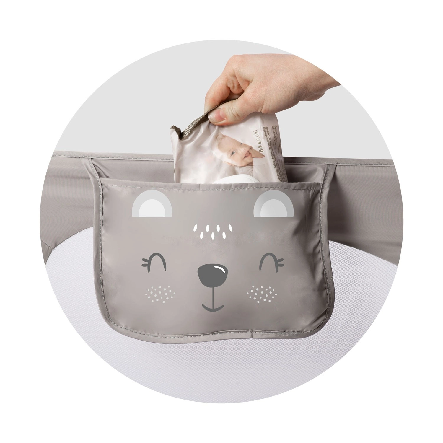 Ugradnja je gotova u nekoliko trenutaka – ogradu možete pričvrstiti vijcima na okvir kreveta ili je učvrstiti pomoću SafetyBelt traka (moguće je kombinirati za veću stabilnost). Praktični džep drži pri ruci dudu, igračku ili druge sitnice. Funkcija preklapanja od 180° omogućuje lak pristup djetetu bez potrebe za demontažom.