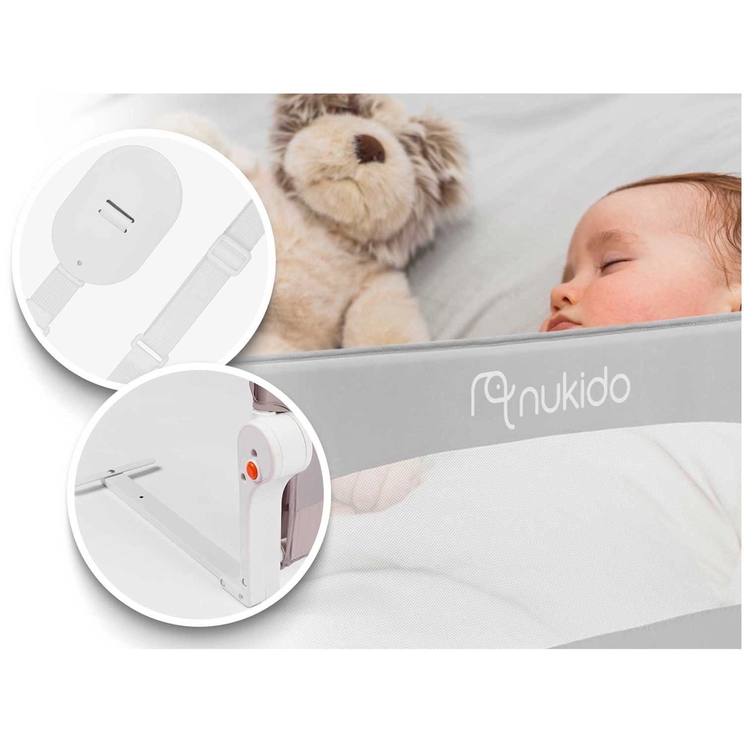 Dječja ograda za krevet Nukido dizajnirana je za maksimalnu sigurnost i udobnost pri svakodnevnoj upotrebi. Izdržljiv, ali lagan čelični okvir zadržava oblik, dok fina i trajnа mrežica pruža odličnu vidljivost na spavajuće dijete i dovoljno provjetravanje. Zahvaljujući aretaciji protiv samosklapanja ograda ostaje čvrsto na mjestu i tijekom življe igre.