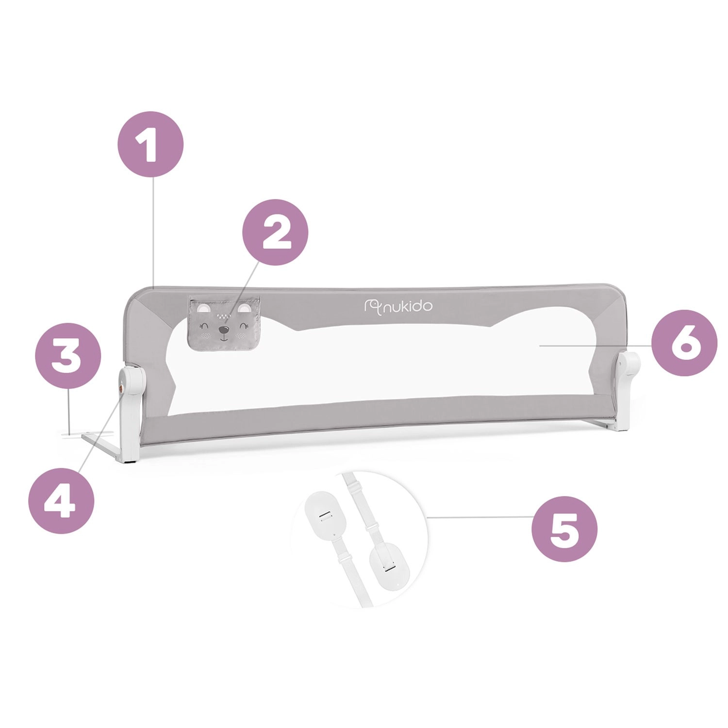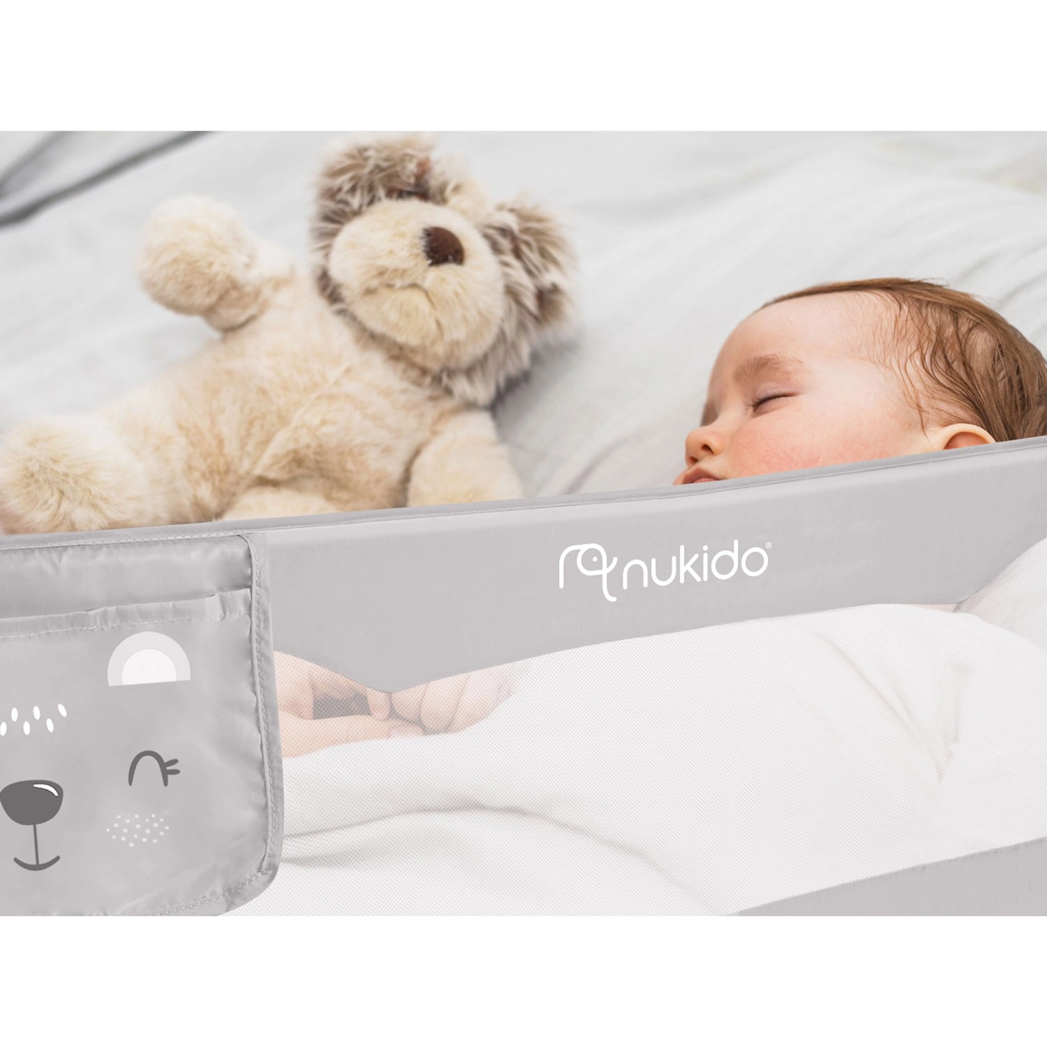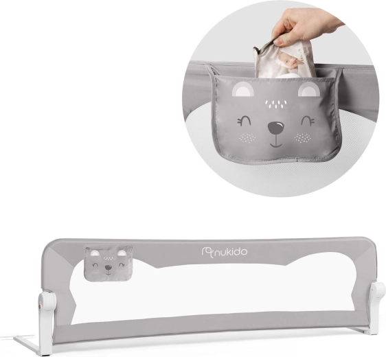 Sigurna i praktična zaštitna ograda za krevet Nukido štiti dijete od pada s kreveta, a istodobno omogućuje jednostavan nadzor zahvaljujući prozirnoj prozračnoj mrežici. Ima čvrst čelični okvir, preklapanje do 180° s sigurnosnom bravom protiv samovoljnog spuštanja, brzu montažu na okvir kreveta i SafetyBelt trake za dodatnu stabilnost. Praktičan džep za sitnice drži sve potrebno nadohvat ruke. Usklađeno s normom BS 7972:2001+A1:2009.
