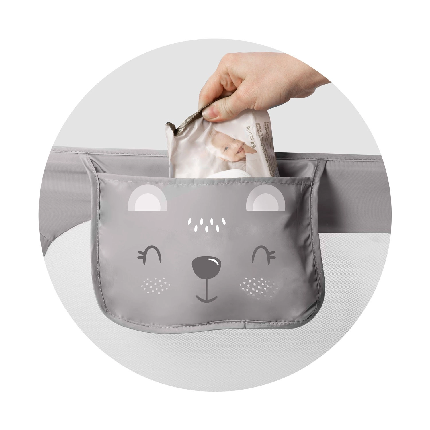 Montaža je brza i fleksibilna: ograda se može pričvrstiti izravno na okvir kreveta pomoću vijaka ili osigurati SafetyBelt trakama – za maksimalnu stabilnost moguće je kombinirati obje metode. Sigurnosna brava sprječava neželjeno sklapanje tijekom uporabe, a praktični džep drži dudu, maramice ili male igračke uvijek pri ruci.