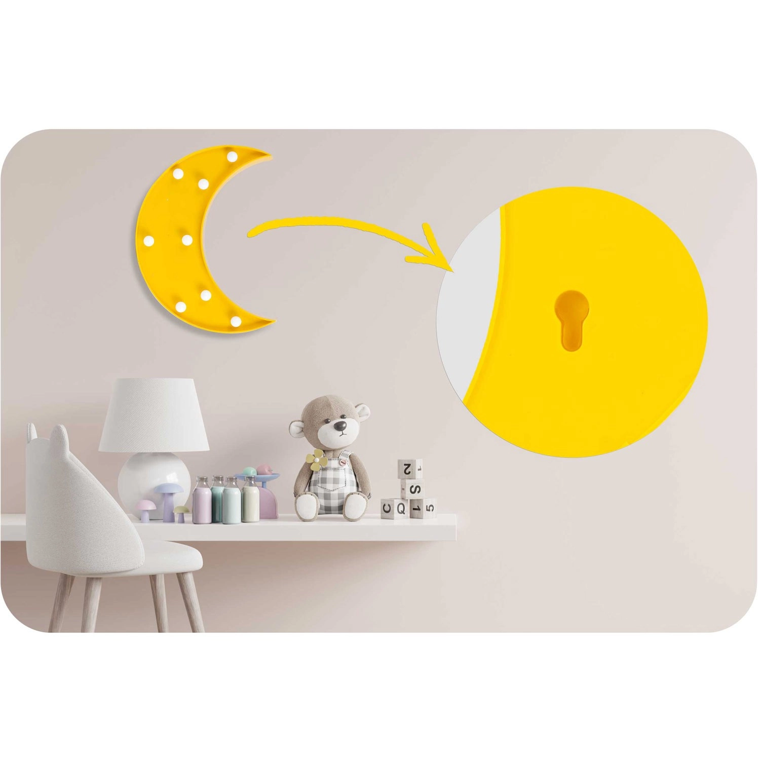 Instalacija je vrlo jednostavna: lampicu možete postaviti na policu ili je zahvaljujući otvoru za vješanje smjestiti na zid. Minimalistički oblik polumjeseca u intenzivnoj žutoj boji upotpunit će moderne i razigrane interijere te će razveseliti predškolce i tinejdžere.