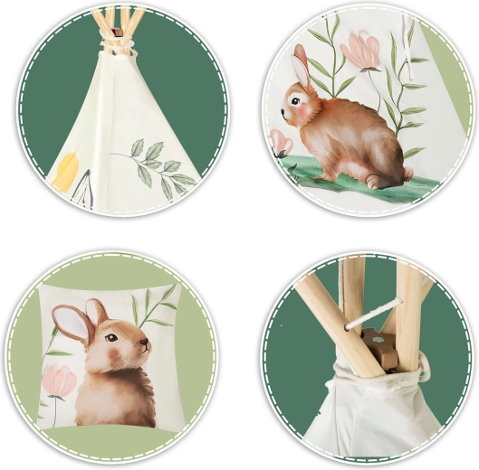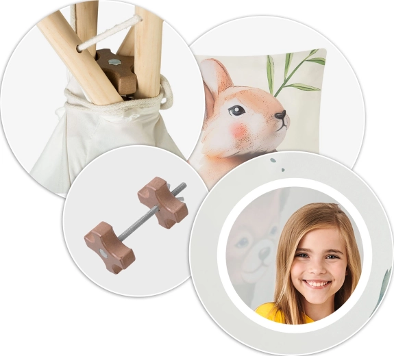 Dizajn je nastao u suradnji s dizajnericom specijaliziranom za proizvode za djecu. Harmonične boje i autorske ilustracije podupiru razvoj osjetila i estetske percepcije. Praktični detalji poput okruglog prozorčića, vezivog ulaza i ušivene podloge pružaju maksimalnu udobnost. U pakiranju ćete pronaći i mekani jastučić s motivom zečića za još ugodniji kutak.