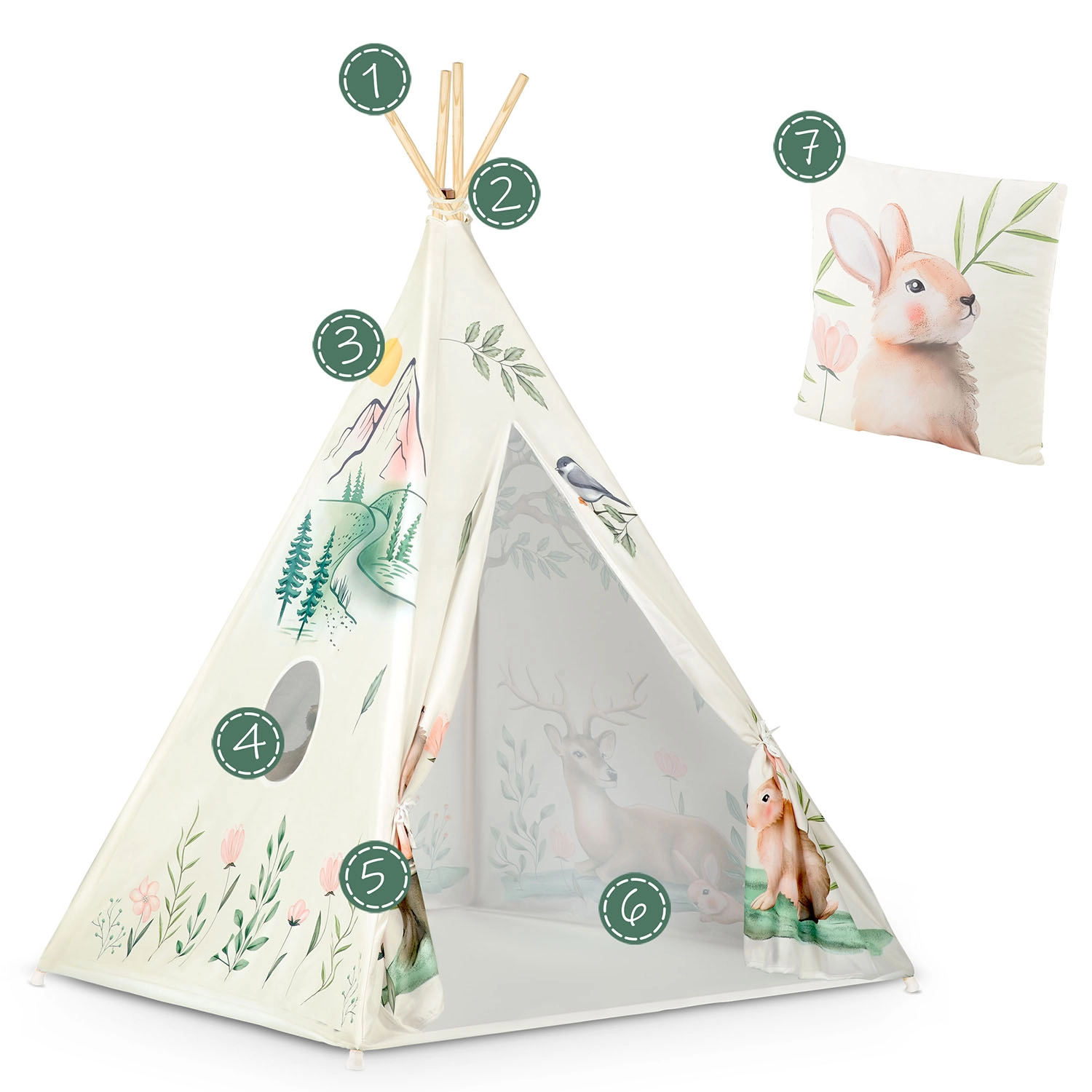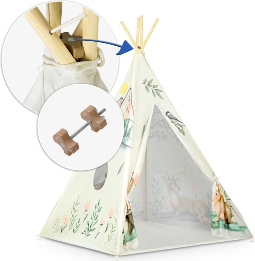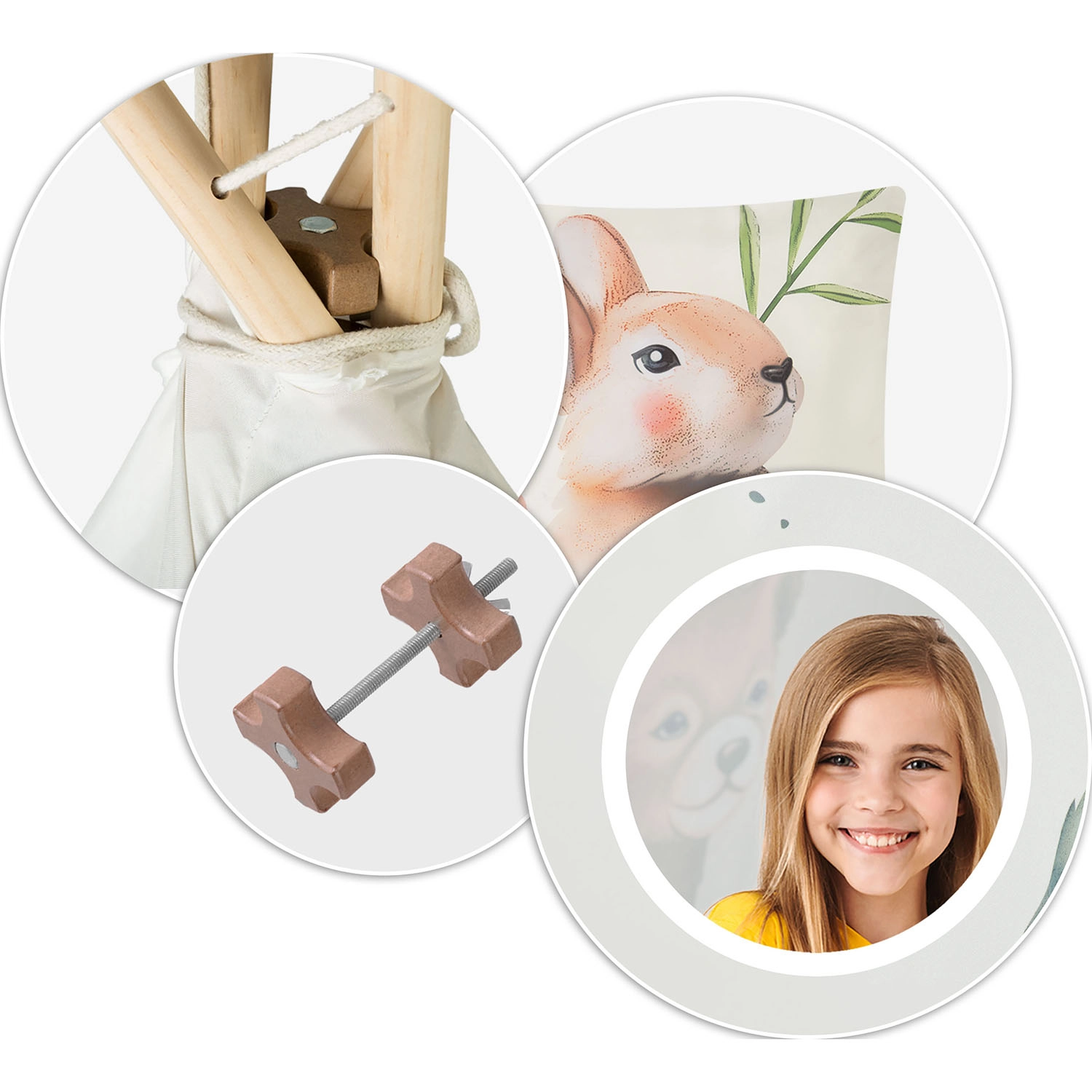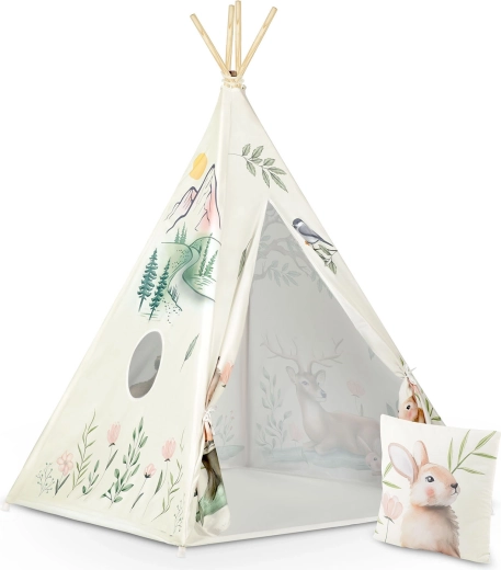 Stvorite djeci njihov vlastiti skrovište – stilski dječji teepee NUKIDO u bež izvedbi s ilustracijama šumskih životinjica. Nudi sigurne certificirane materijale, stabilnu konstrukciju sa stabilizatorom (unaprijeđenim za 2025.) i jednostavno sklapanje. U kompletu je mekani jastučić s zečićem BESPLATNO, okrugli prozorčić i ušivena podloga. Savršen kutak za igru, čitanje i odmor u duhu Montessorija.