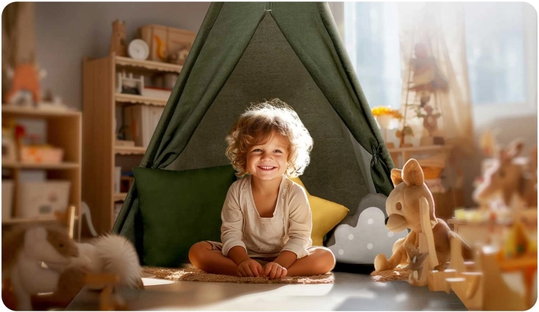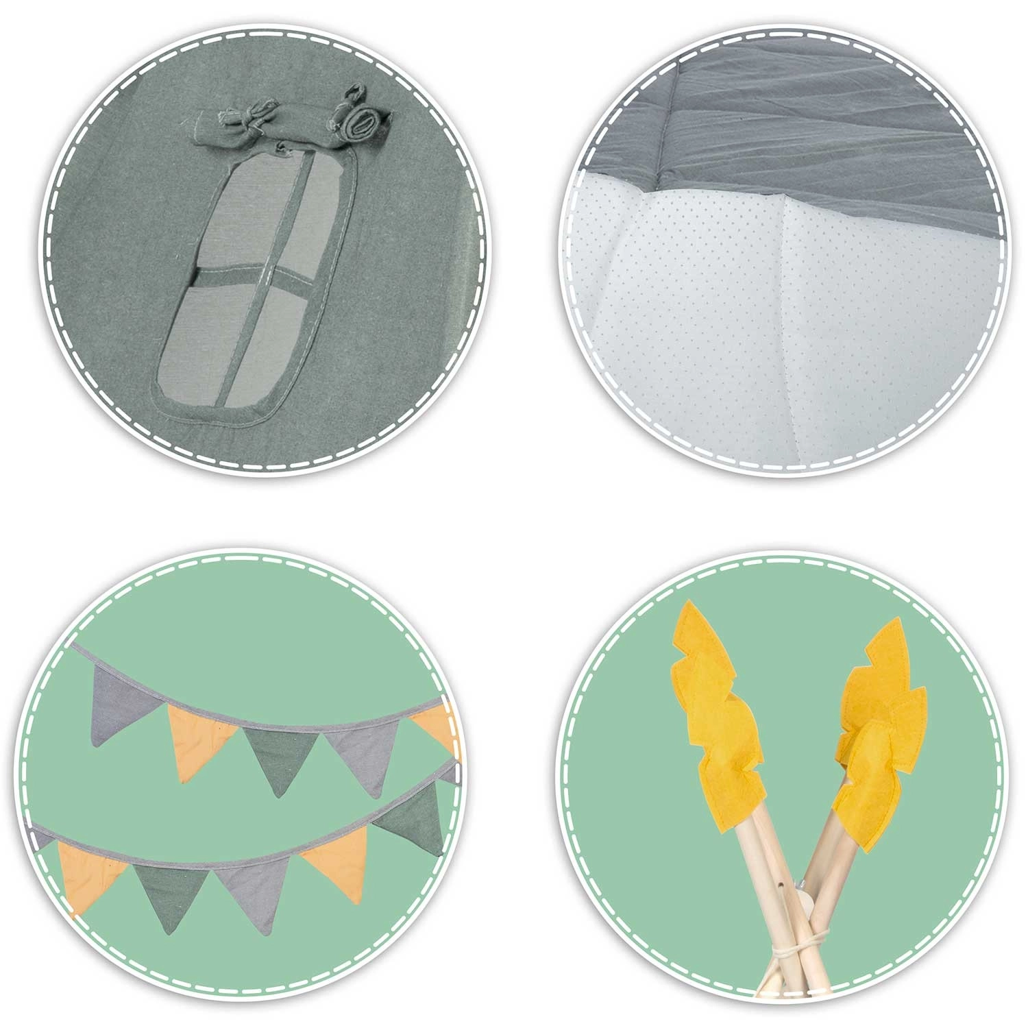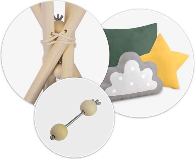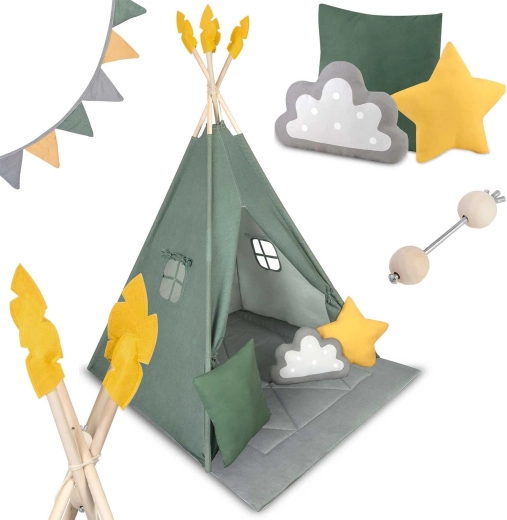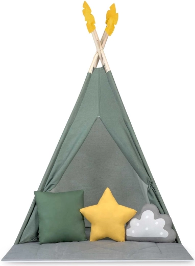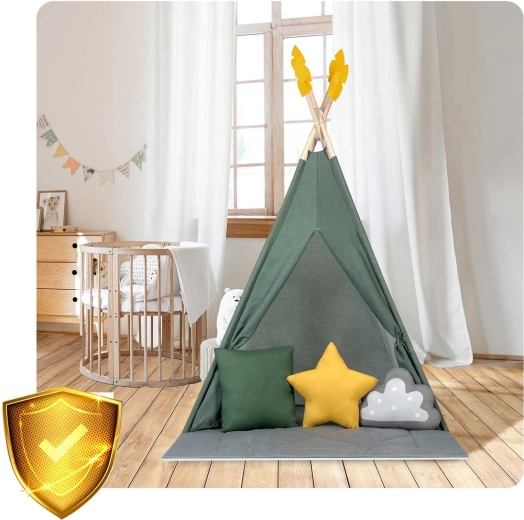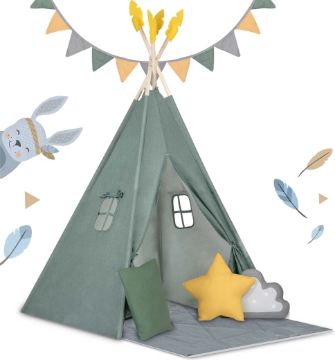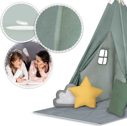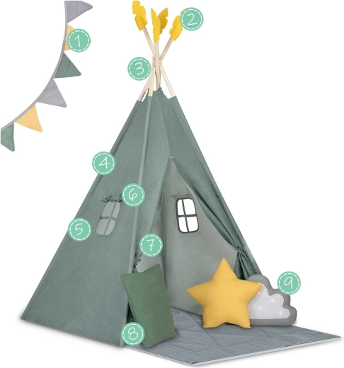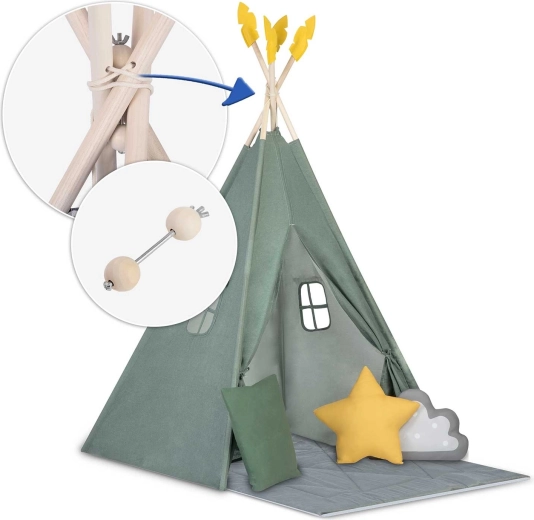 Dječji teepee Nukido je ugodan kutak za igru koji se prirodno uklapa u dječju sobu. Mješavina premium pamuka s visokom gramaturom 175 g/m2 je prozračna, mekana i čvrsta, pa odolijeva svakodnevnim avanturama. Harmonična zelena boja s razigranim akcentima podupire osjetilni razvoj i potiče maštu.